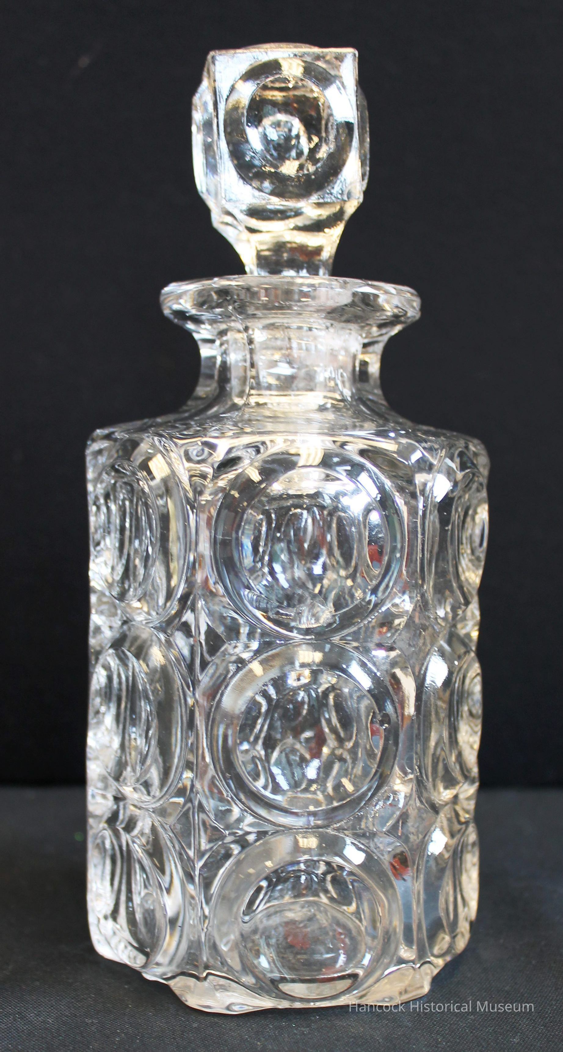 6" tall 6 sided cologne bottle in Giant Bullseye pattern from Bellaire Goblet Company Findlay, oh with square 2" tall stopper of Giant Bullseye pattern.Collection