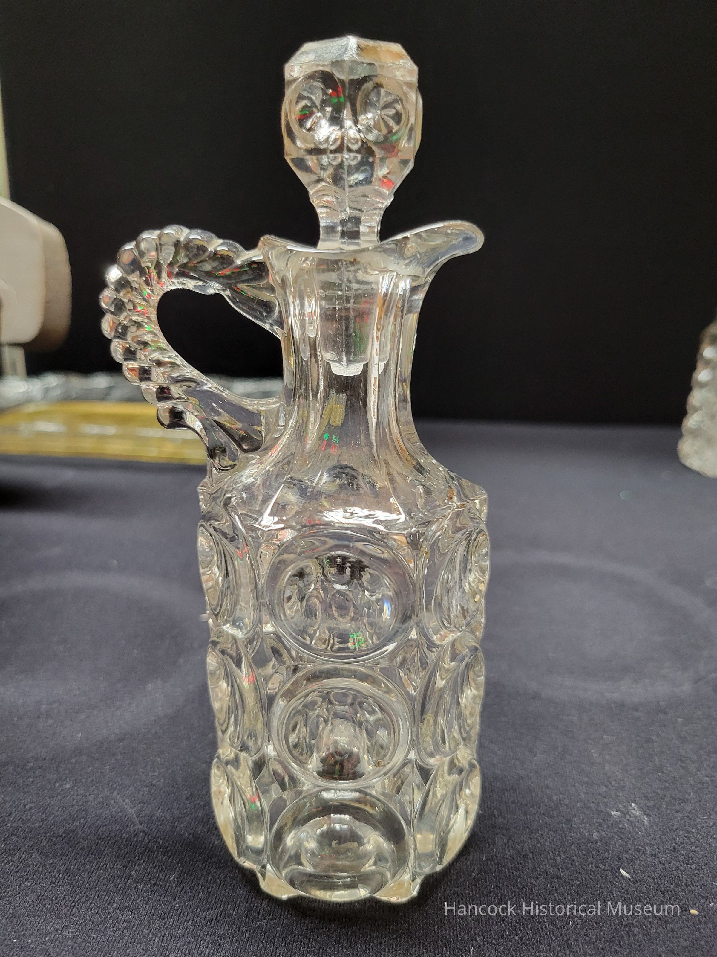 5" tall clear glass cruet in Bullseye pattern with square stopper in bullseye pattern 1" tall from Model Flint Glass Co, Findlay, Oh undated.Collection