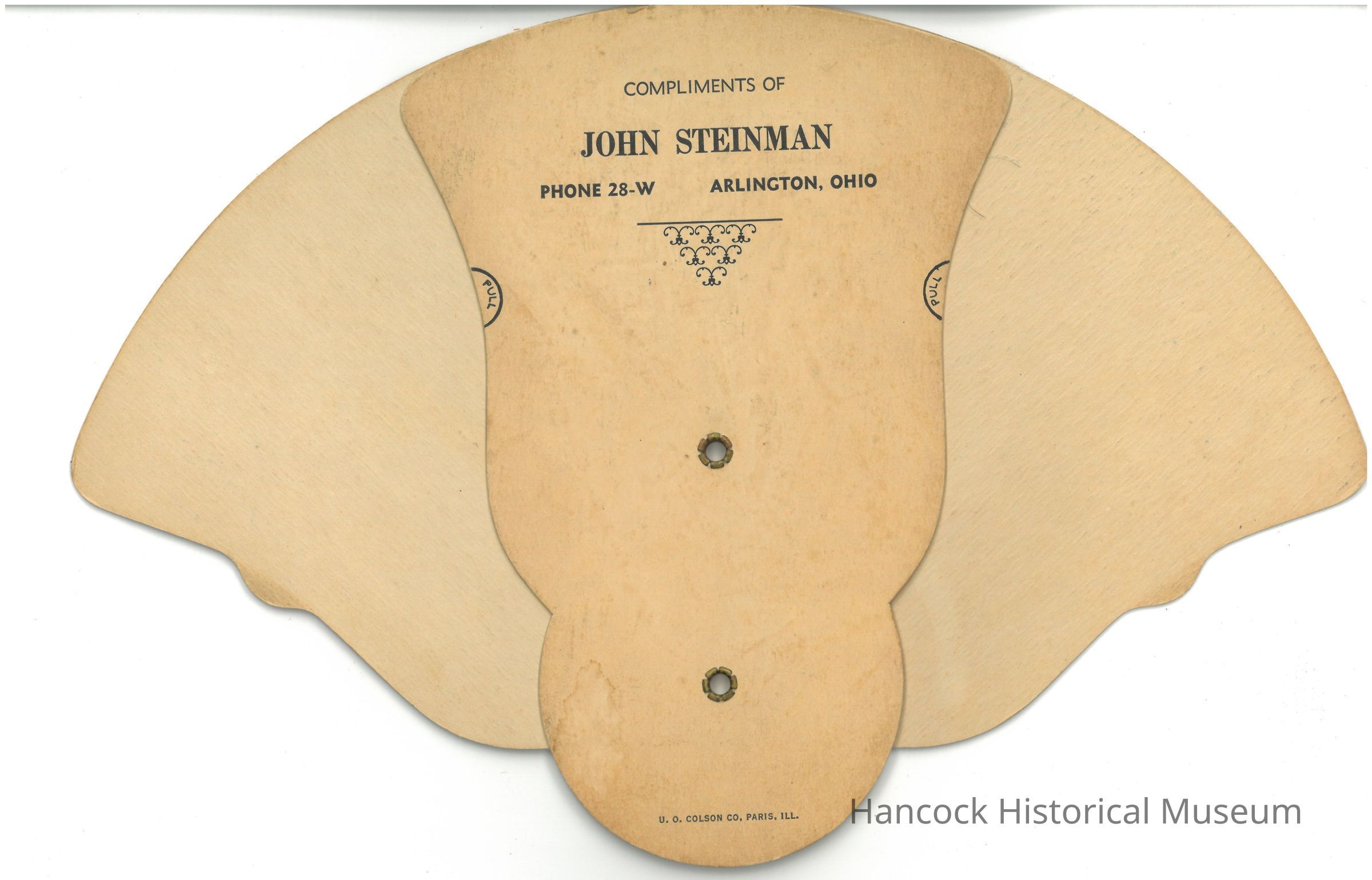 Paper fan with the Last Supper on one side. On the back it says Compliments of John Steinman of Arlington, Ohio