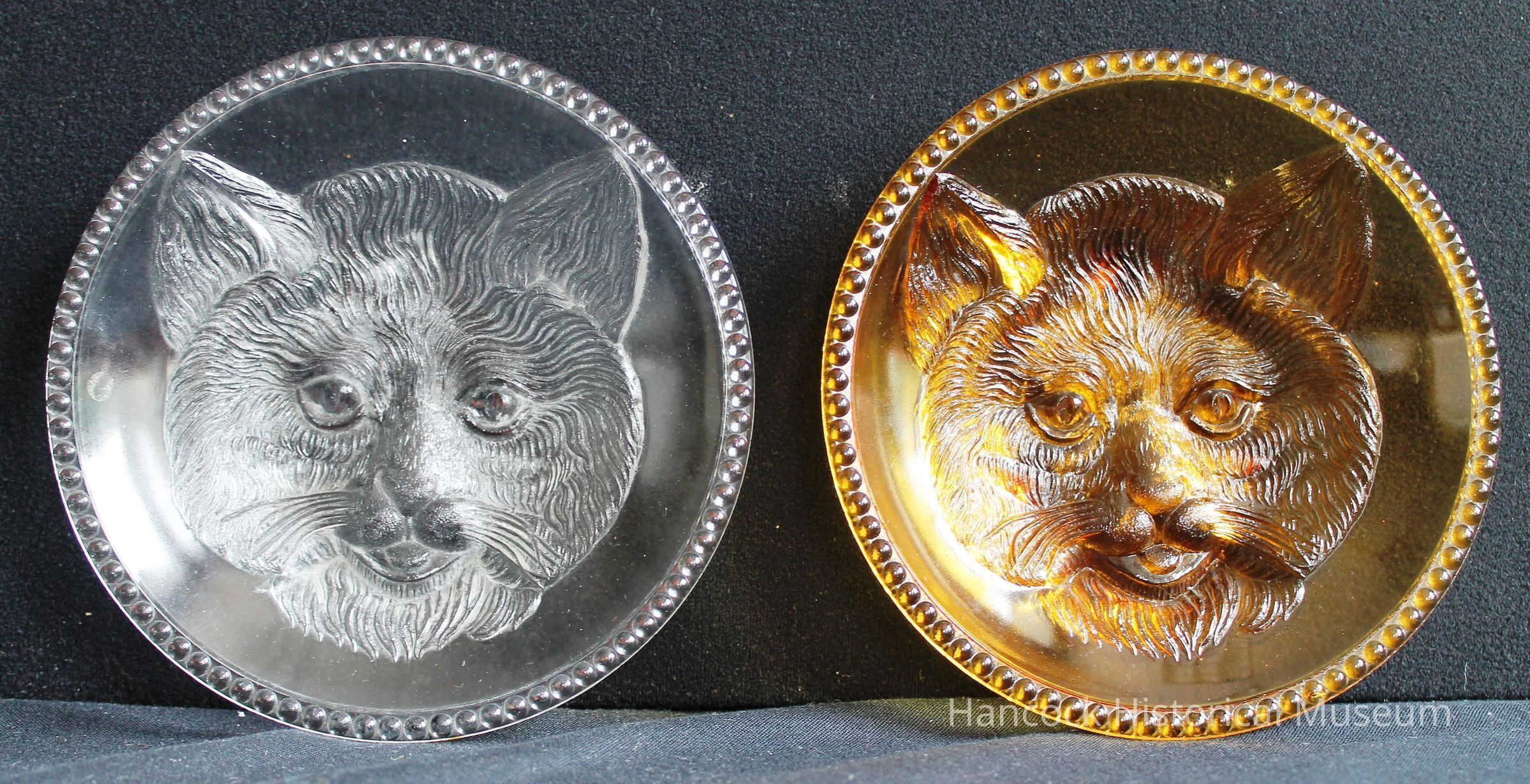 6" round clear glass cat dish from Columbia Glass Co, Findlay, Oh undated.