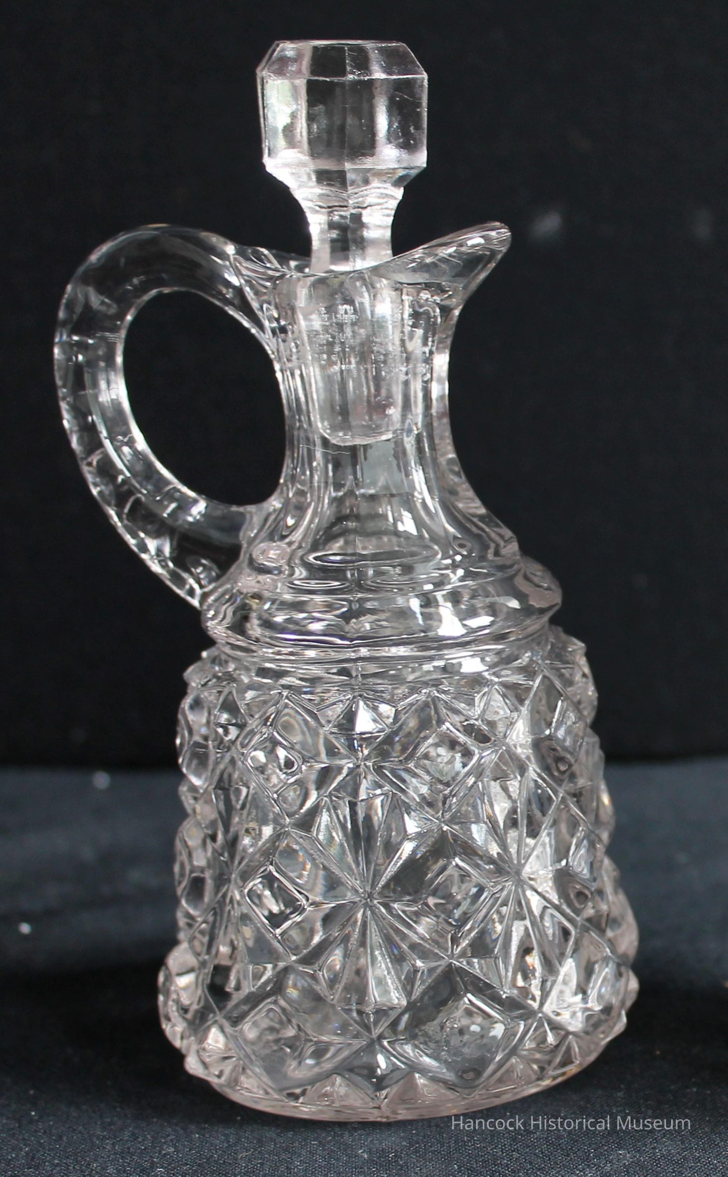 6 1/2" tall clear glass Beveled Block & Fan pattern cruet with six sided stopper from Model Flint Glass Co, Findlay, Oh