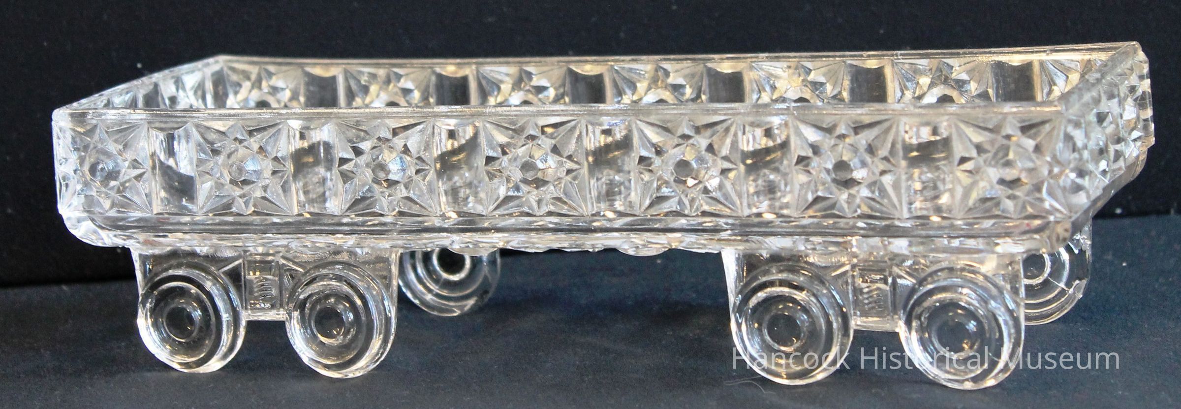 Clear glass railroad car with stars and bars pattern from Bellaire Goblet Co, Findlay, Oh.Collection