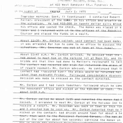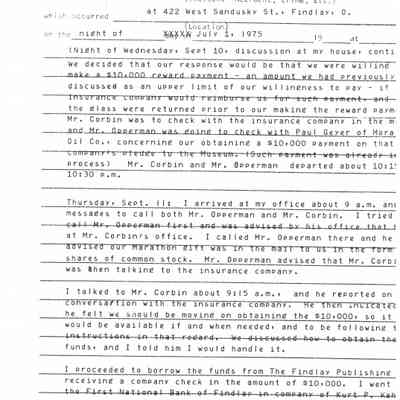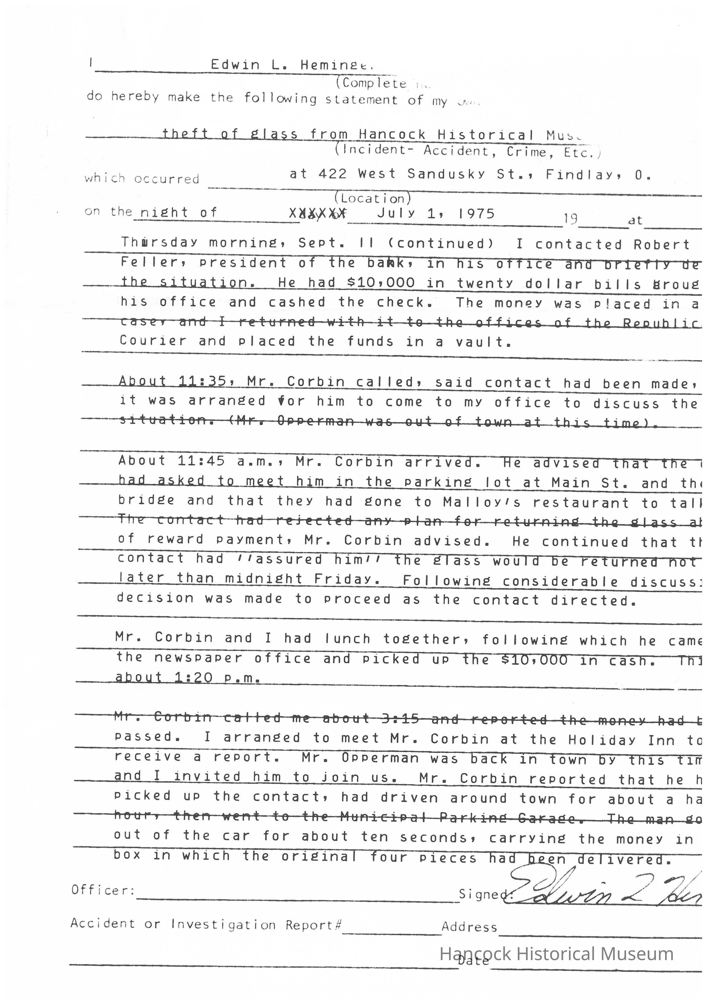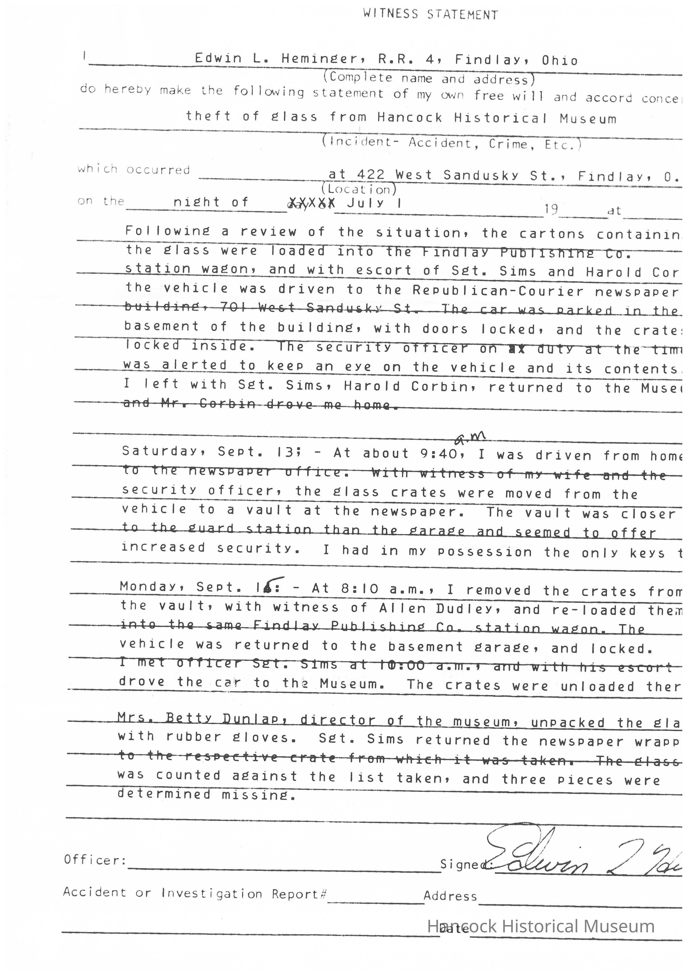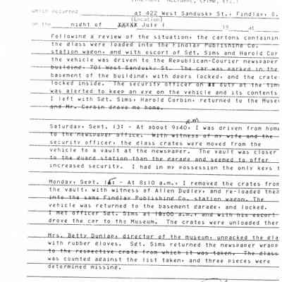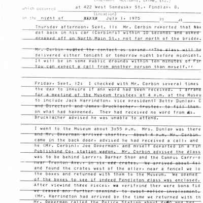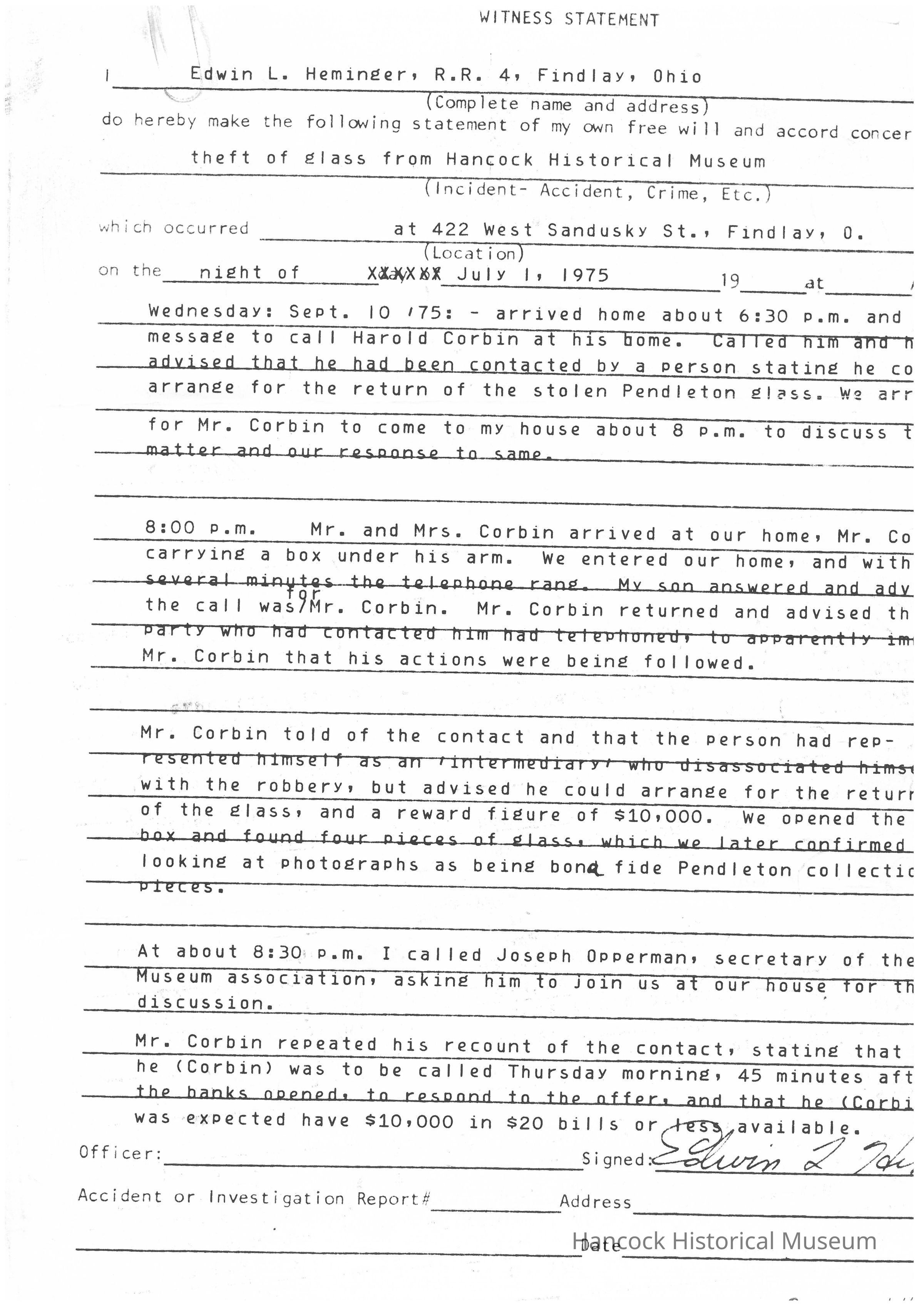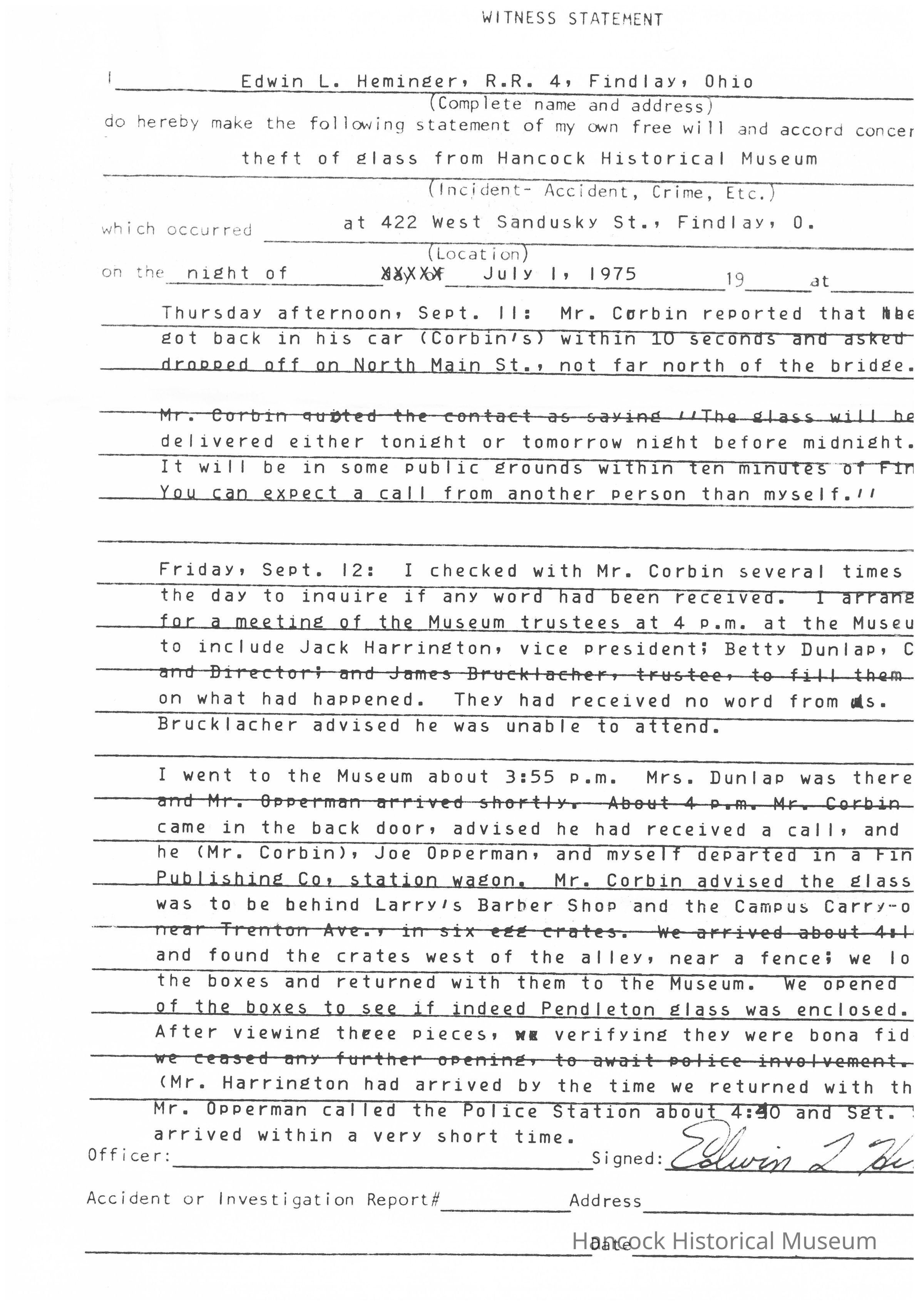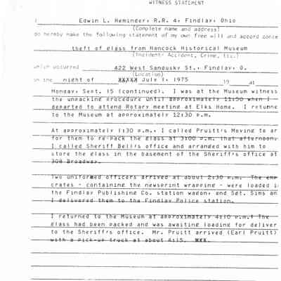 Ed Heminger's witness statement to the Findlay Police Department regarding the theft and recovery of the Pendleton Glass Collection in July of 1975Collection