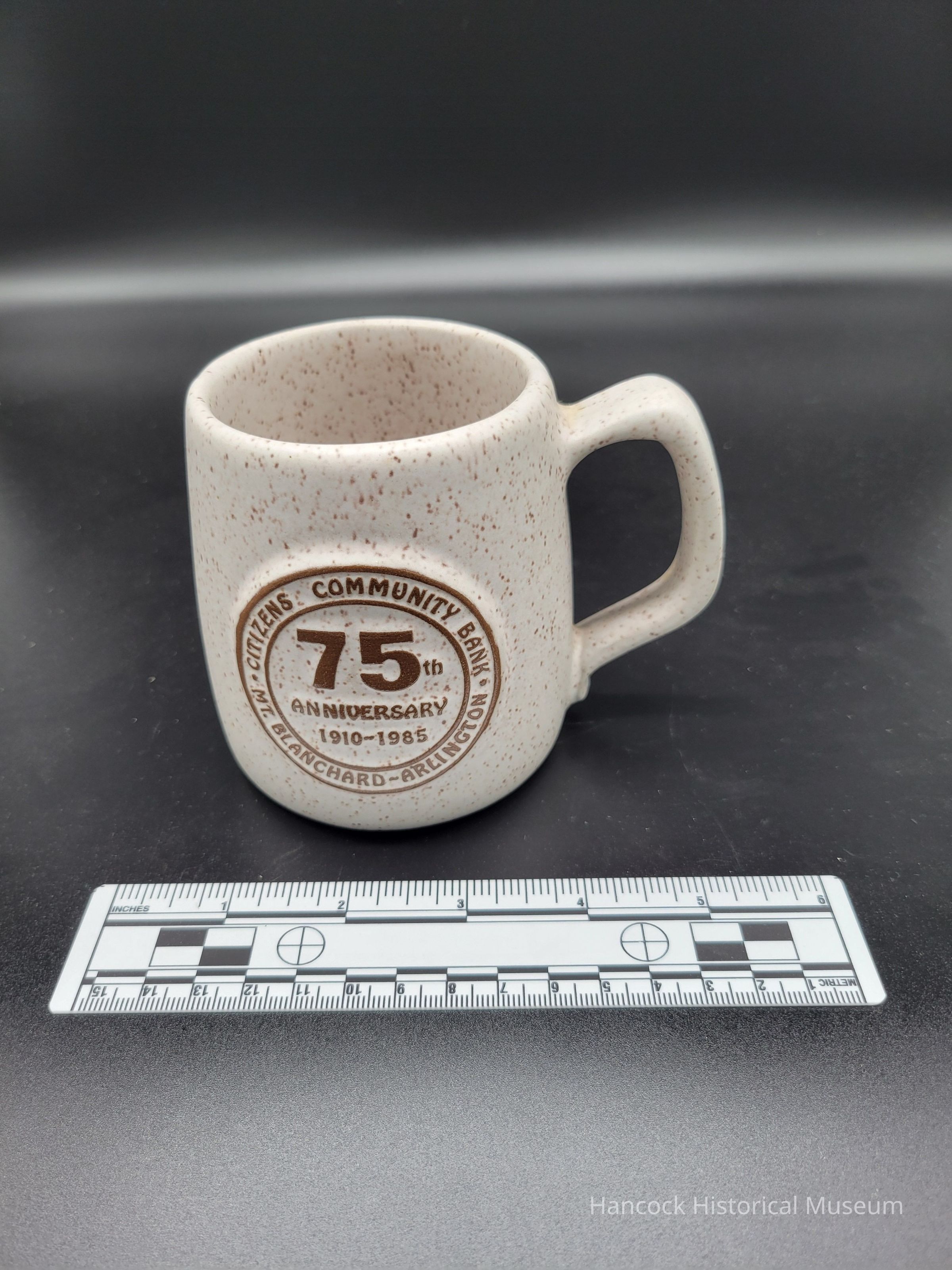 3 1/2: x 4: round ceramic coffee mug from Citizens Community Bank, Mt Blanchard & Arlington, Oh. 75th Anniversary 1910-1985.Collection