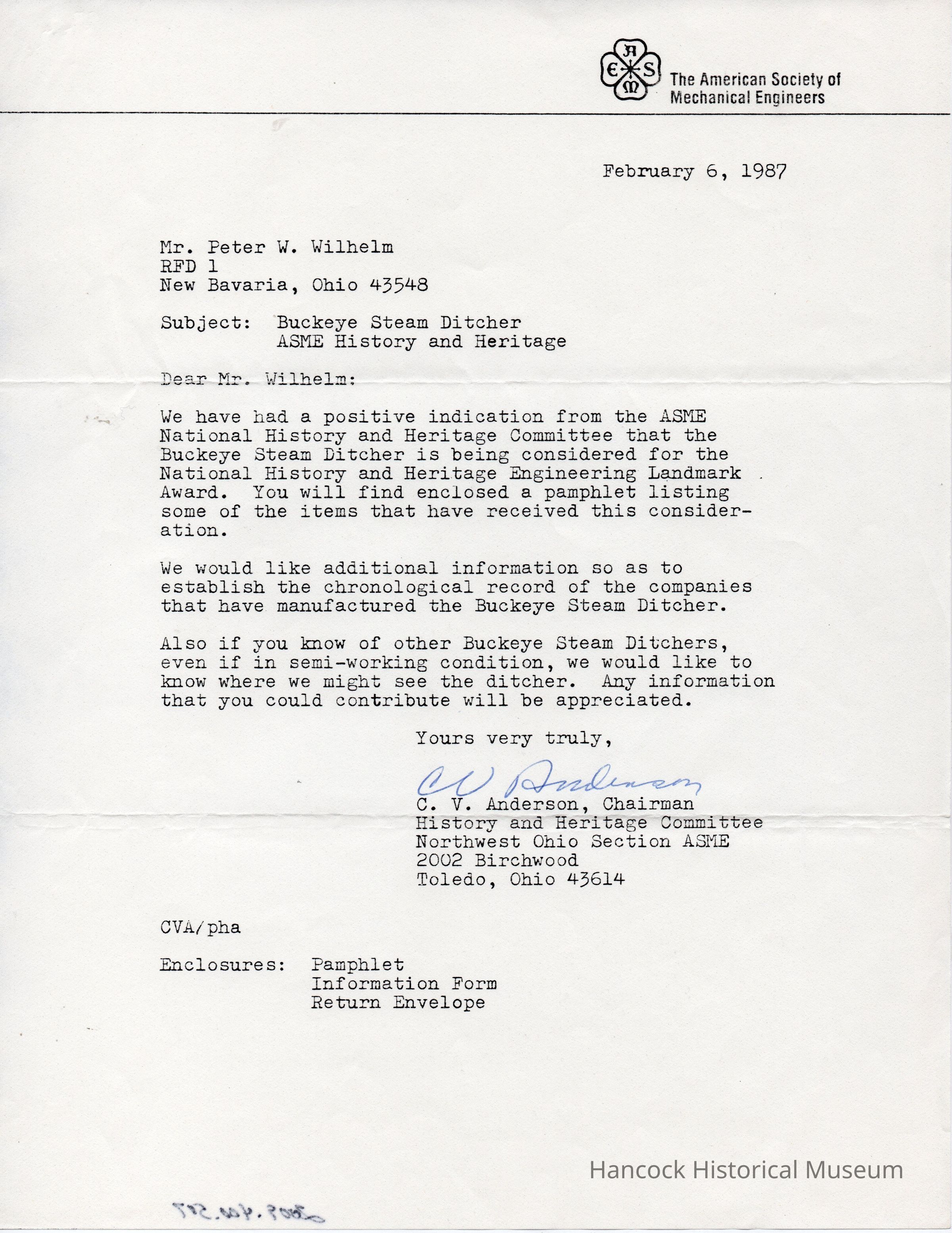 Letter from C V Anderson to Peter W Wilhelm, dated Feb 6, 1987 on Buckeye Traction Ditcher Co, 100 Crystal Ave, Findlay, Oh.Collection