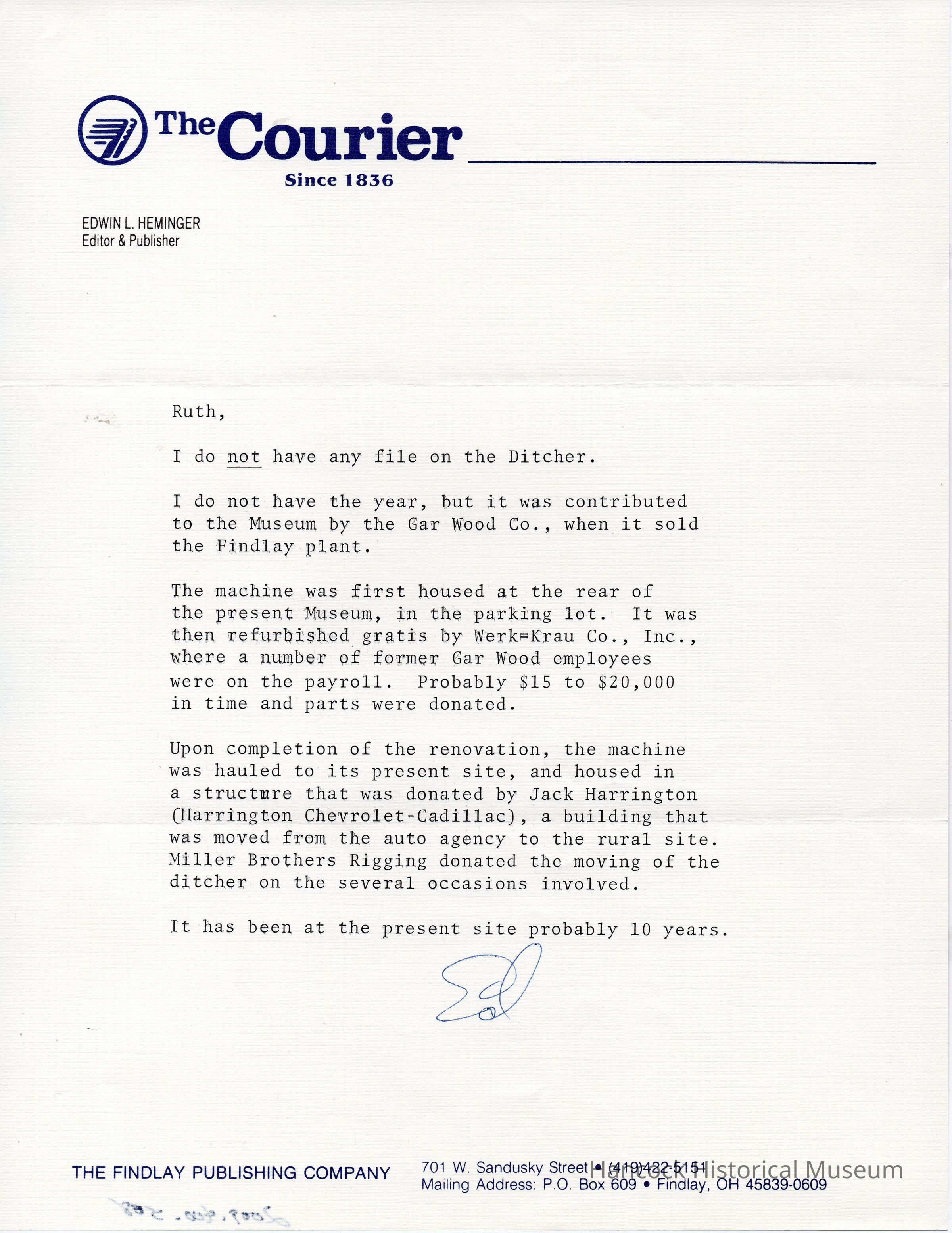 Letter from Ed Heminger to Ruth Haley, undated, on Buckeye Traction Ditcher Co, 100 Crystal Ave, Findlay, Oh.Collection