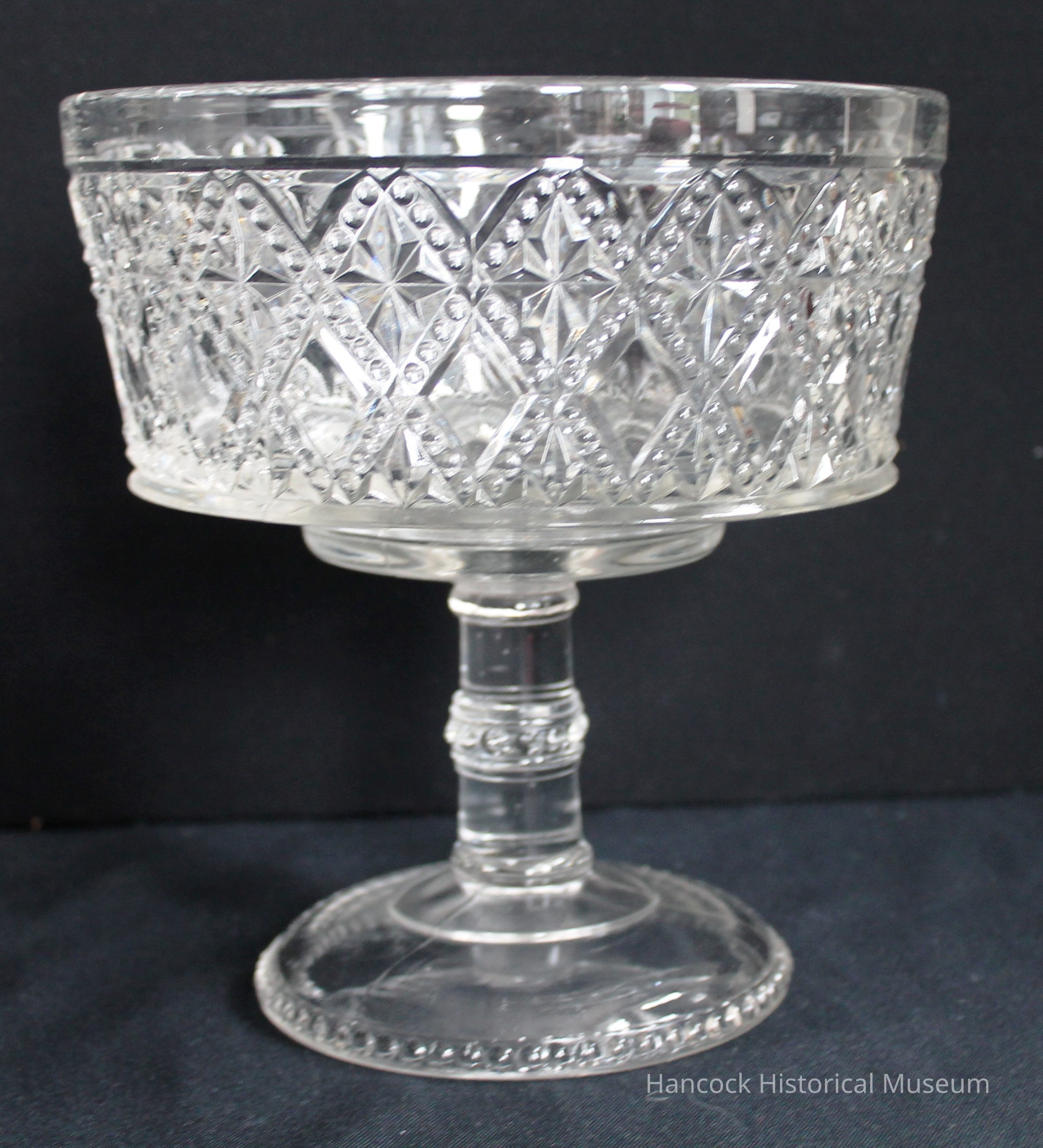 7 1/2" tall x 7" round stemmed clear glass compote in Diagonal Bead Bands pattern from Model Flint Glass Co, Findlay, Oh.
