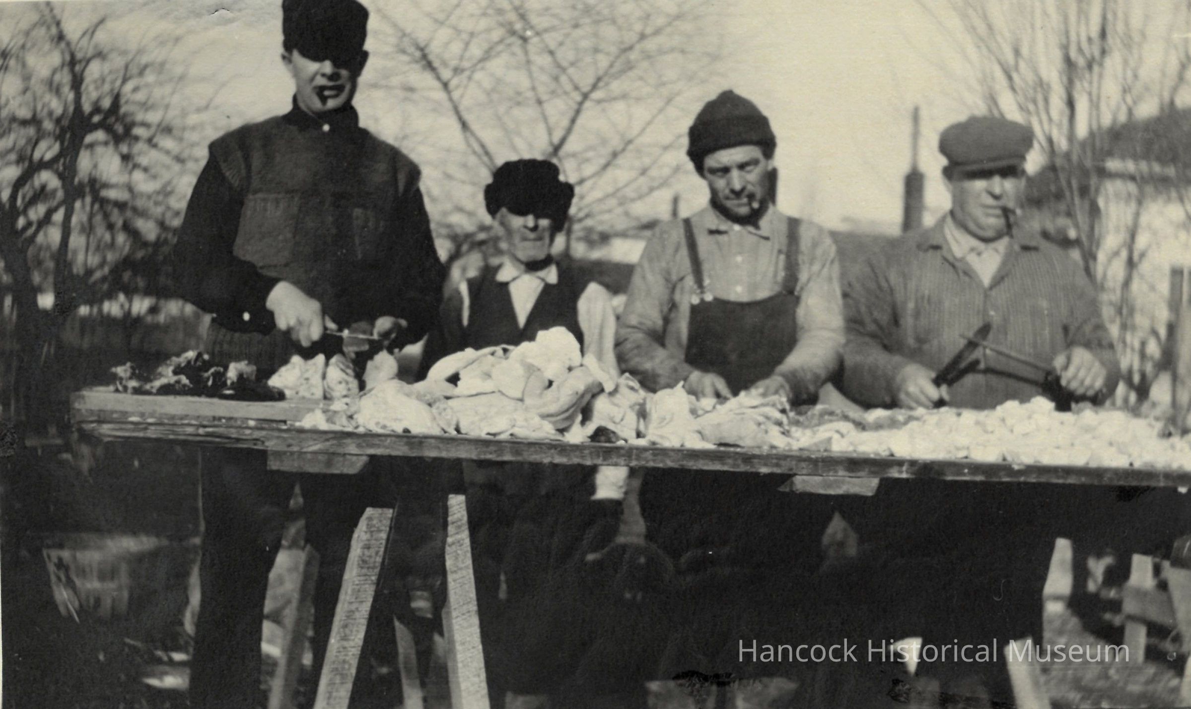 4 x 6 b/w photo of George Beltz & John Schirmer cutting up meat w/two unidentified men outdoors.