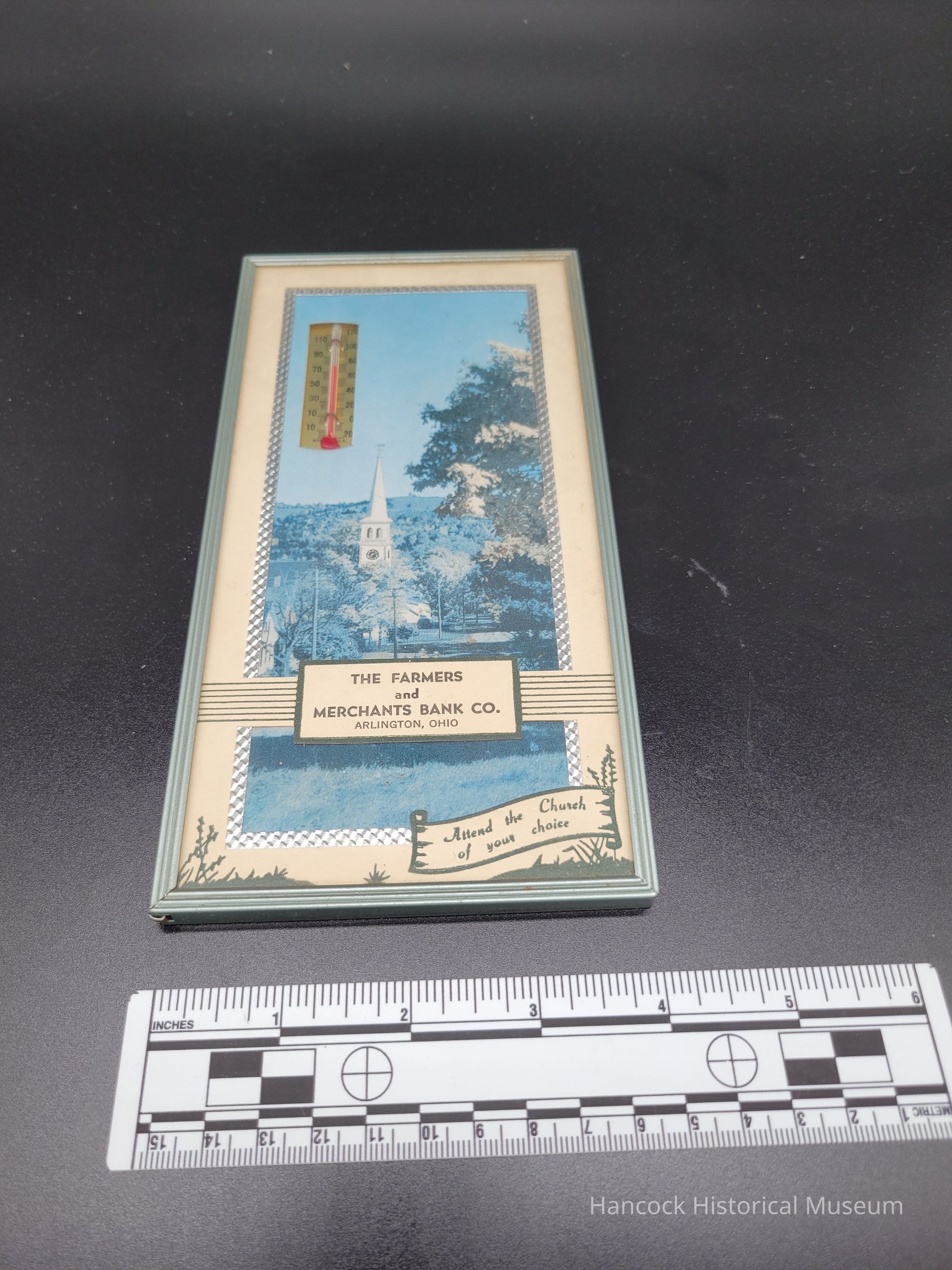 A framed thermometer witha picture of a church steeple advertising The Farmers and Merchants Bank Co, of Arlington, OhioCollection