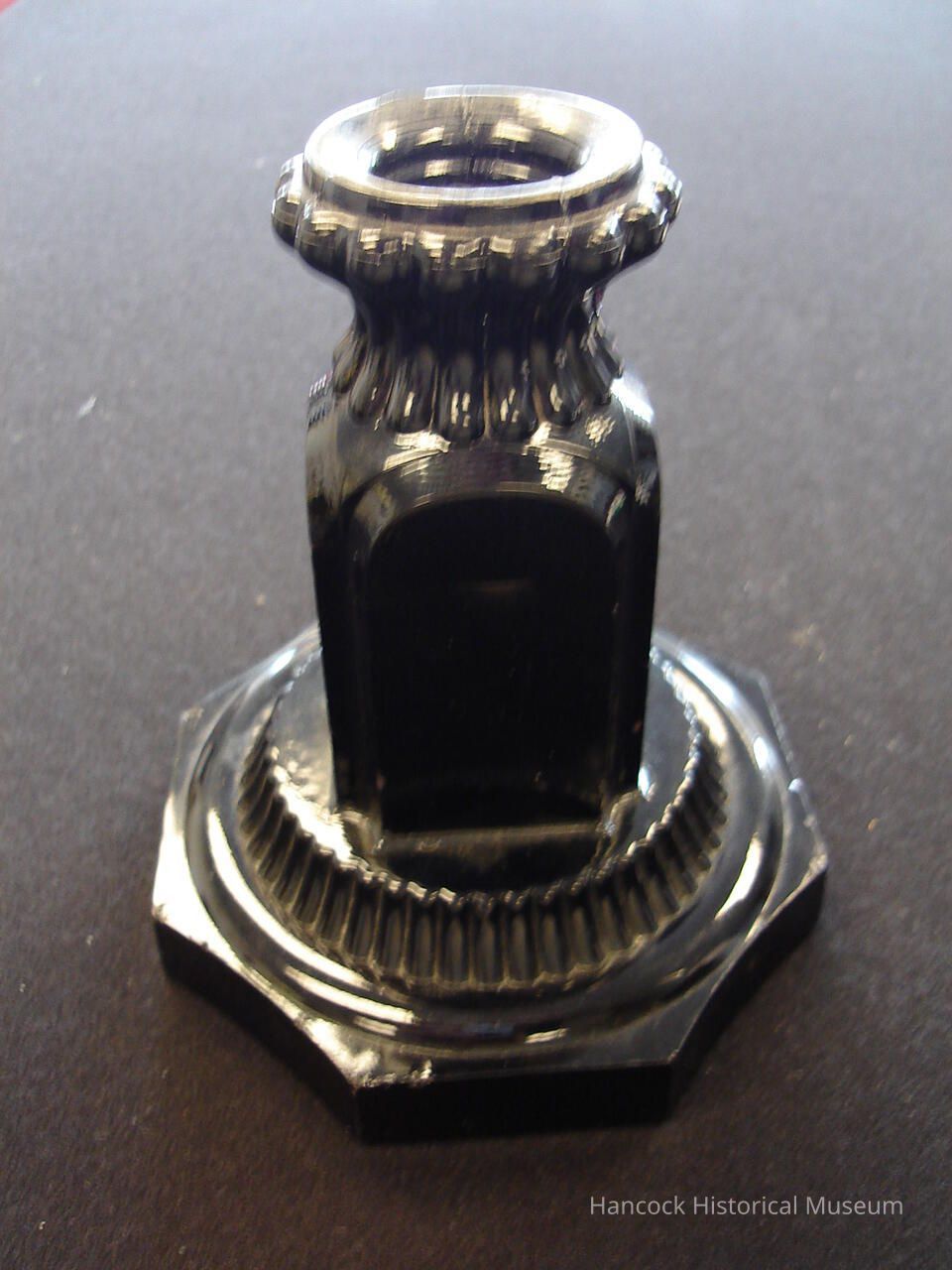 black glass oil or kerosene lamp base - octagonal base 5" with pedestal 5 7/8" high - rim at top broken and glued together. Dalzell, Gilmore & Leighton Co., Findlay OH.Collection