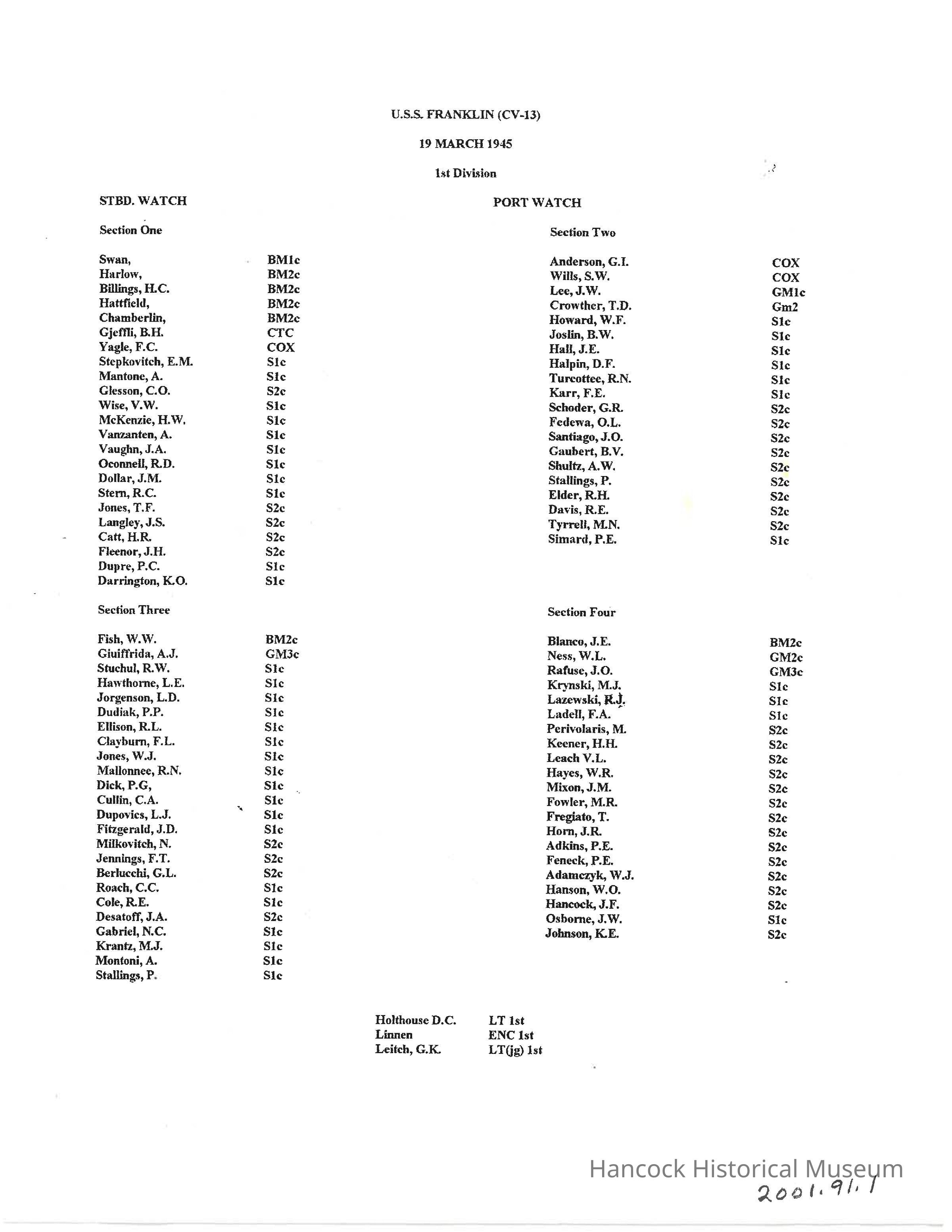 Listing of the roster of the USS Franklin March 19, 1945