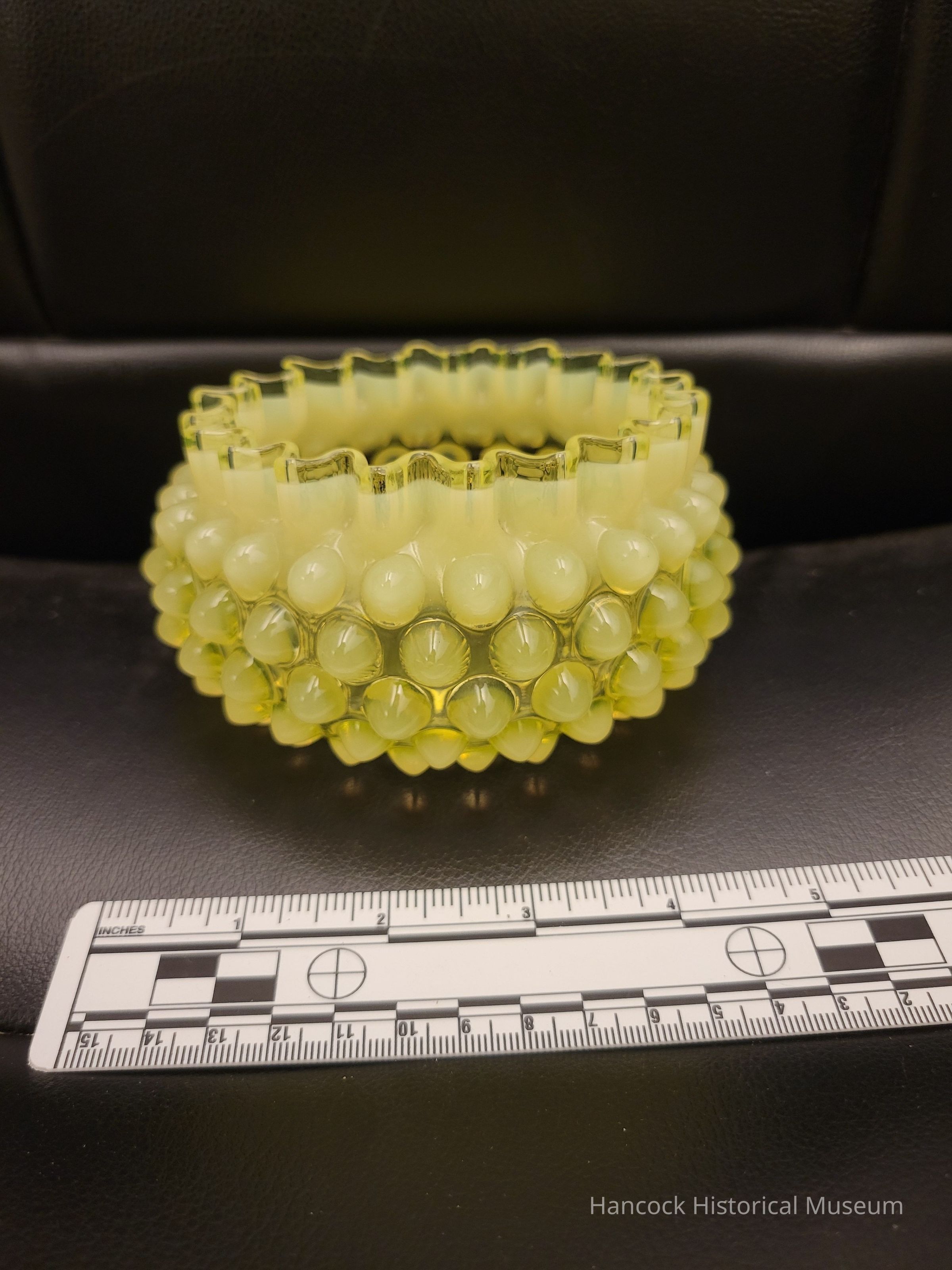 The image shows a decorative glass fingerbowl with a textured surface, placed beside a ruler for scale