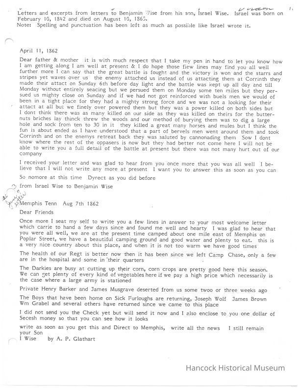 transcript of Civil War letters of Benjamin Wise from Apr 11, 1862 till Aug 21, 1863, typed by Vernon H Smith.