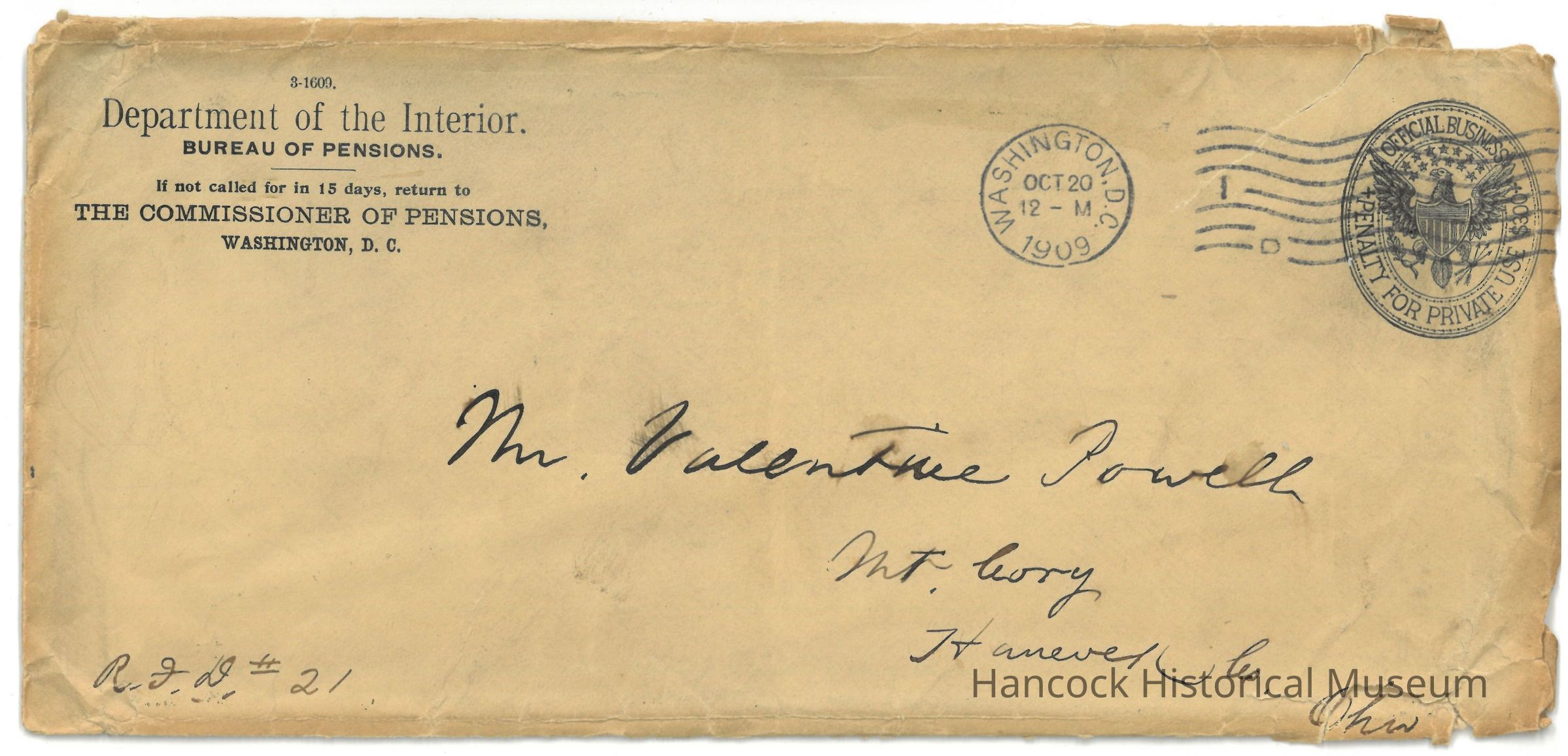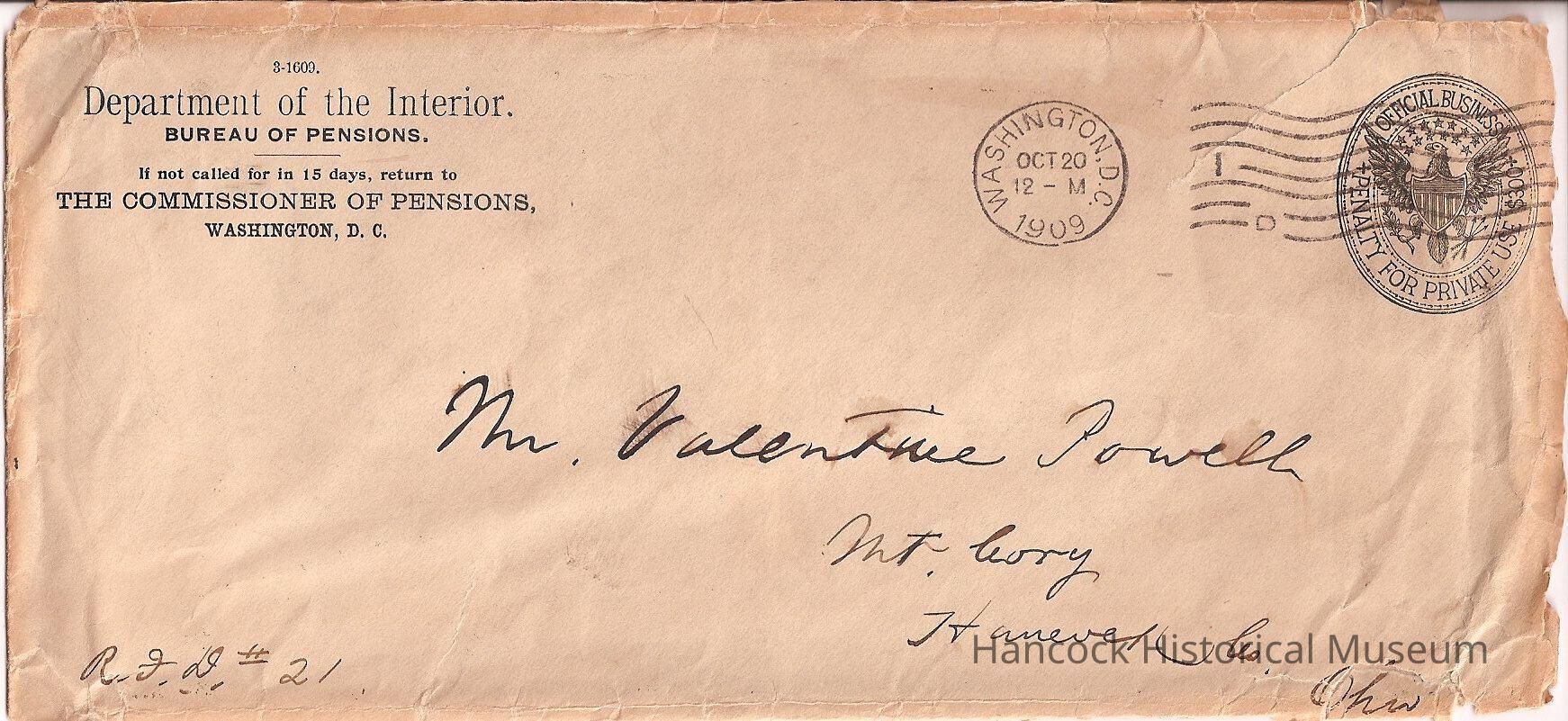 Envelope to Valentine Powell, Mt Cory, Oh from Bureau of Pensions Postmarked Oct 20, 1909.Collection