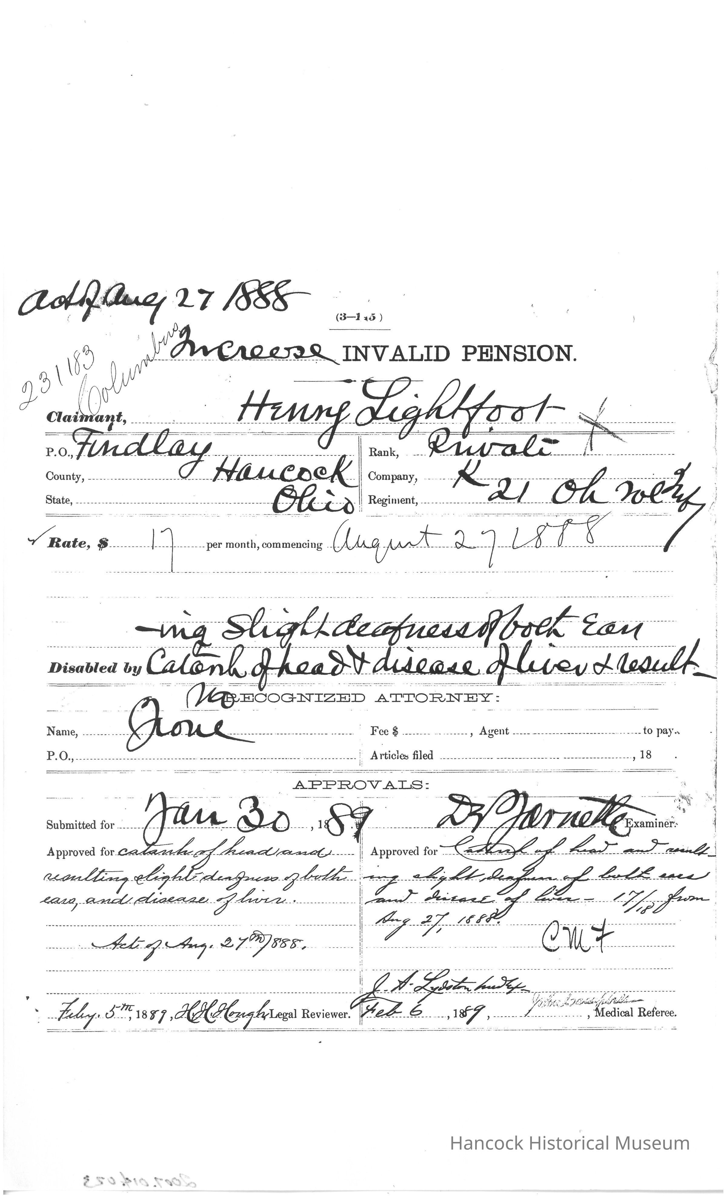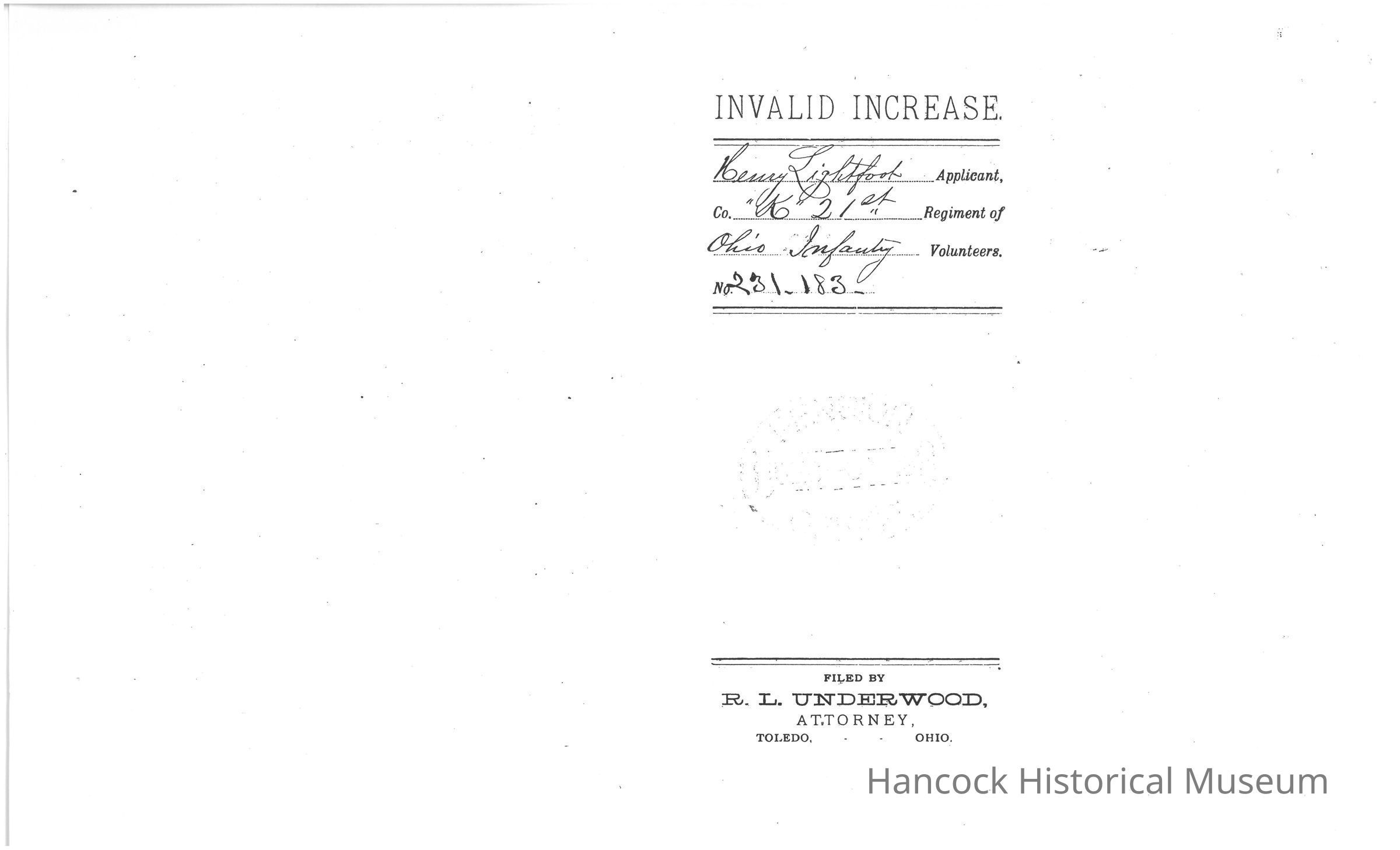 The image shows a historical document titled "Invalid Increase" pertaining to an individual named Henry Lightfoot. He is identified as the applicant, listed under Company K, with an association to the 21st Regiment of Ohio Volunteer Infantry. The document is marked with the number 281.183, indicating a possible reference or file number. It was filed by R. L. Underwood, an attorney based in Toledo, Ohio. The layout is formal, typical of military or legal documentation from historical periods, likely related to a military pension or benefit increase claim. There appears to be a faint seal or stamp near the center of the page, though it is not distinctly visible.