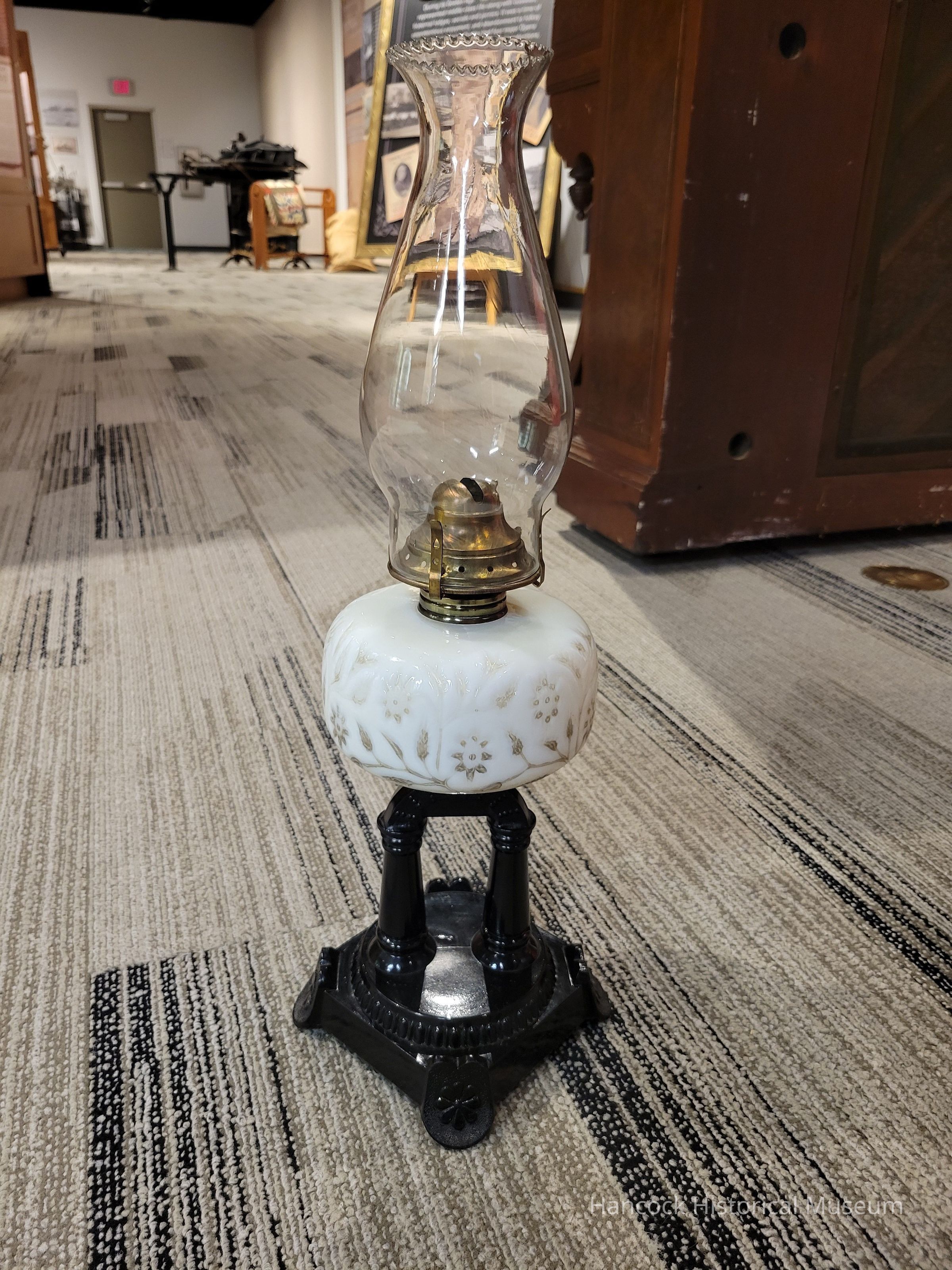 white silver Findlay onyx oil lamp from Dalzell Gilmore Leighton Glass Co, Findlay, Oh.