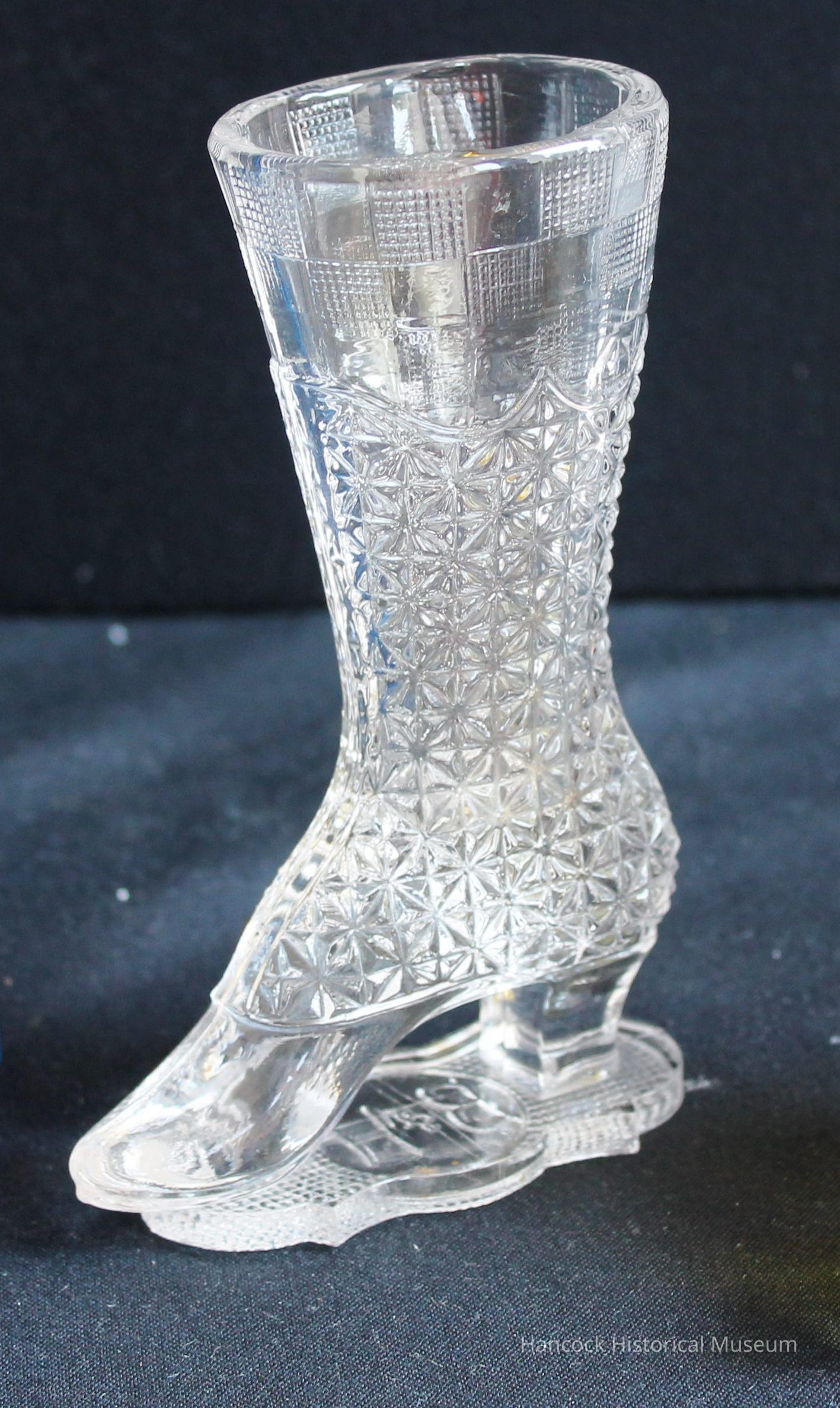 5 1/2" tall clear glass right shoe in Fine Cut Bouquet Holder pattern from Bellaire Goblet Co, Findlay, Oh undated