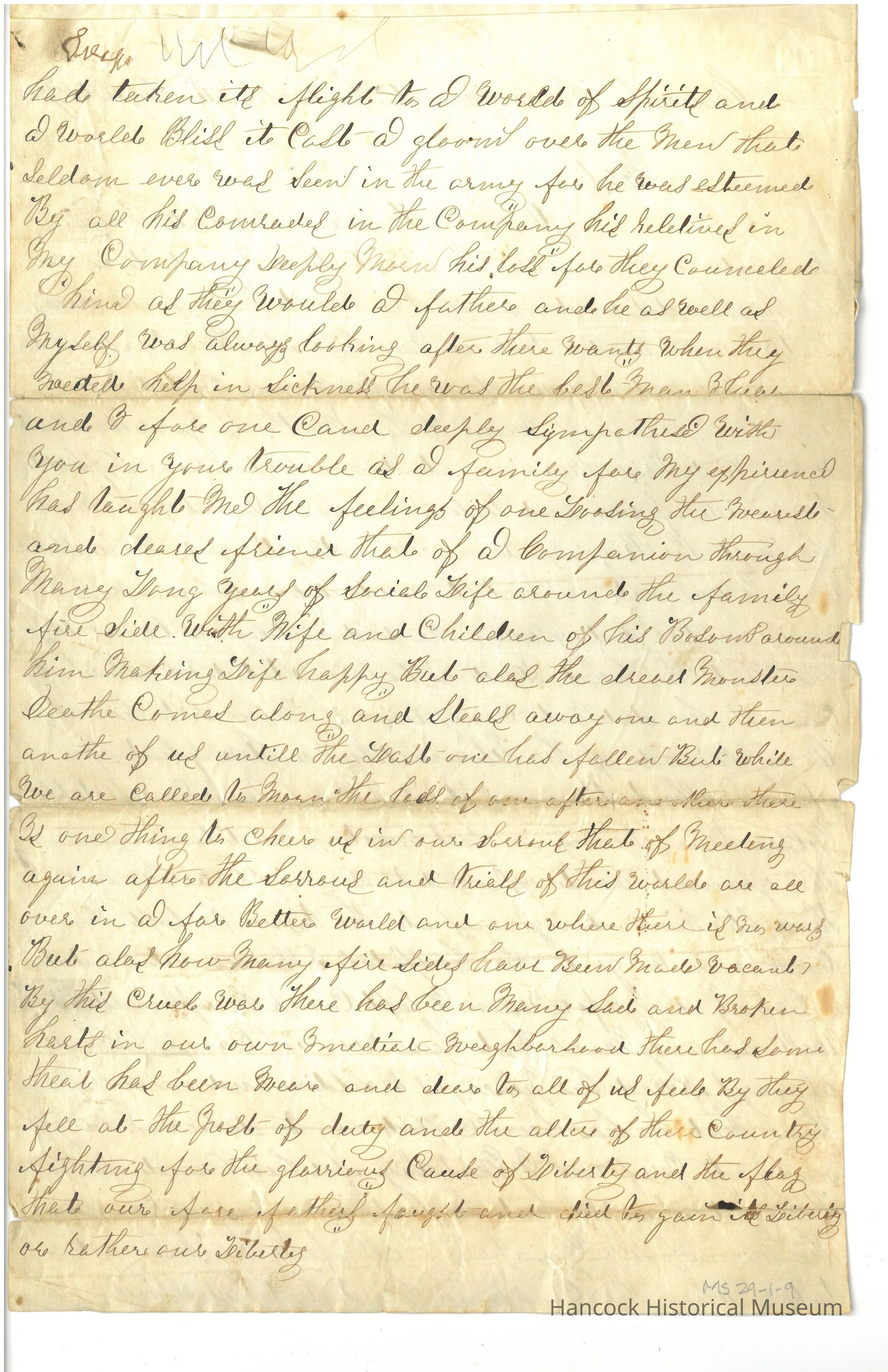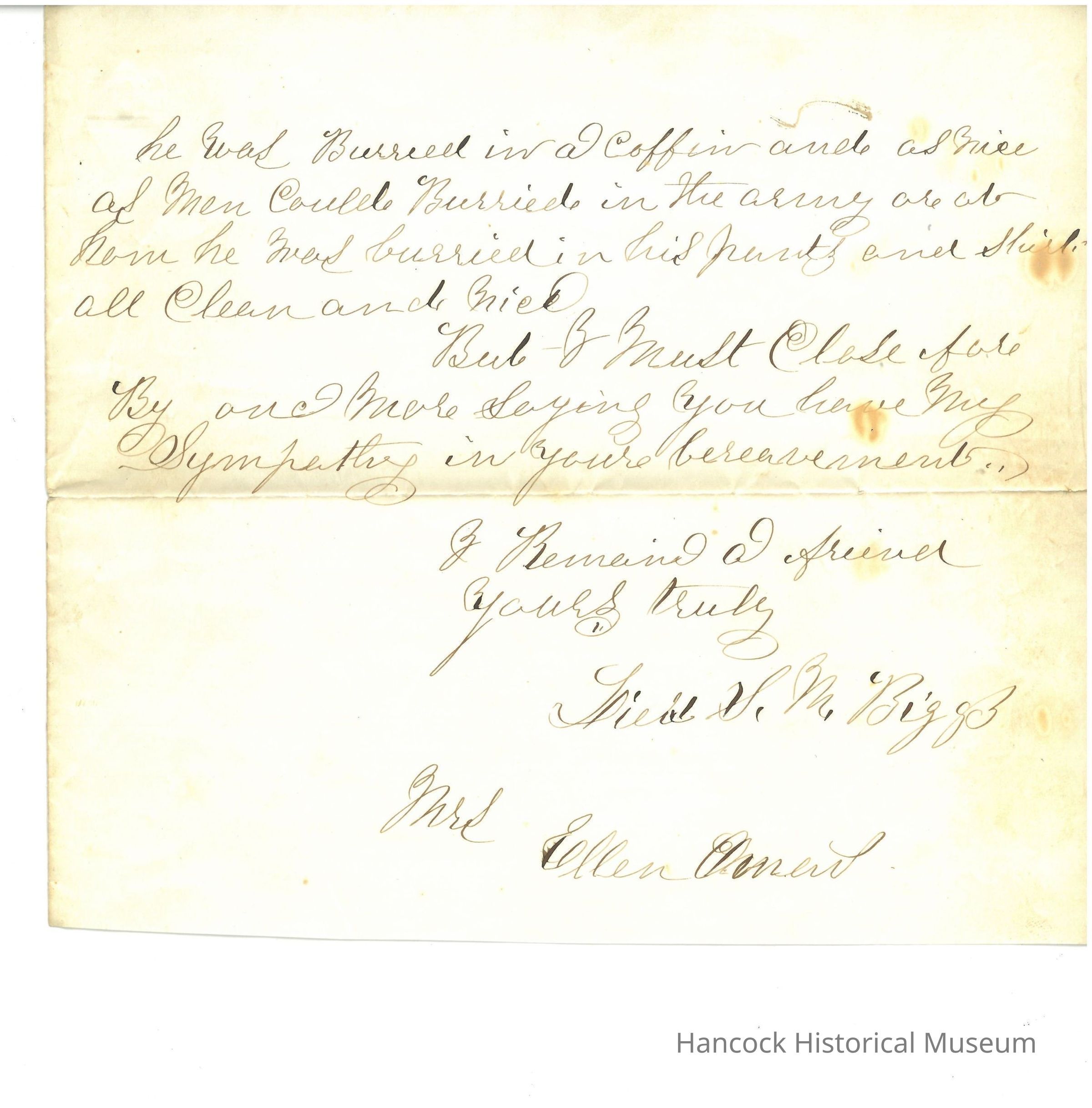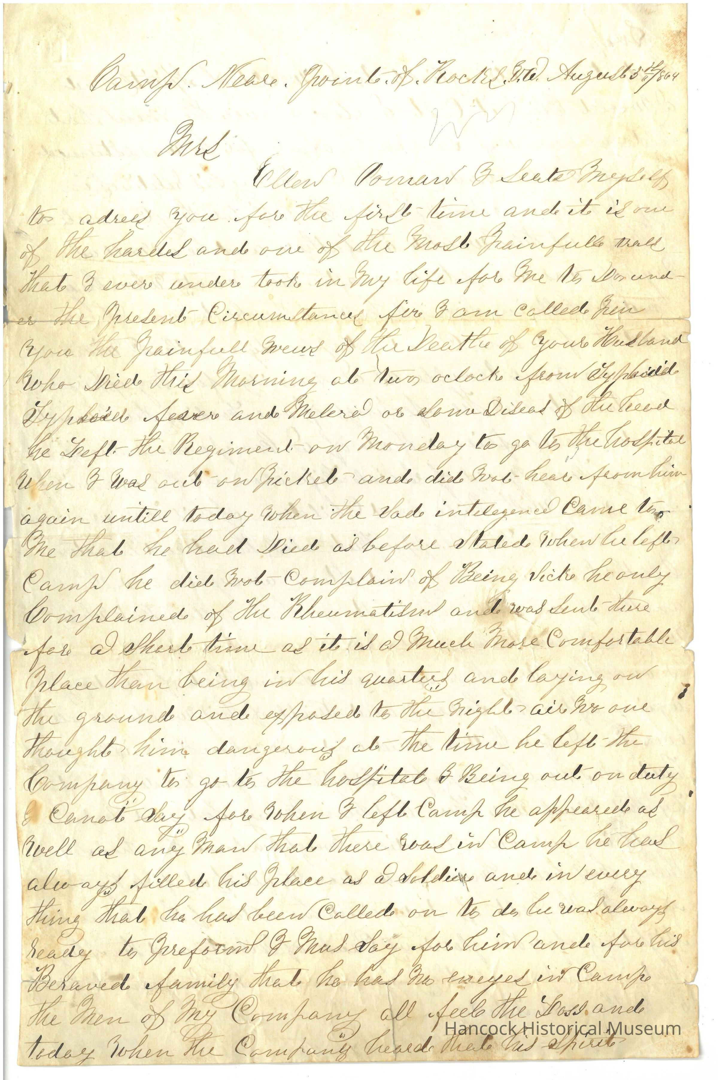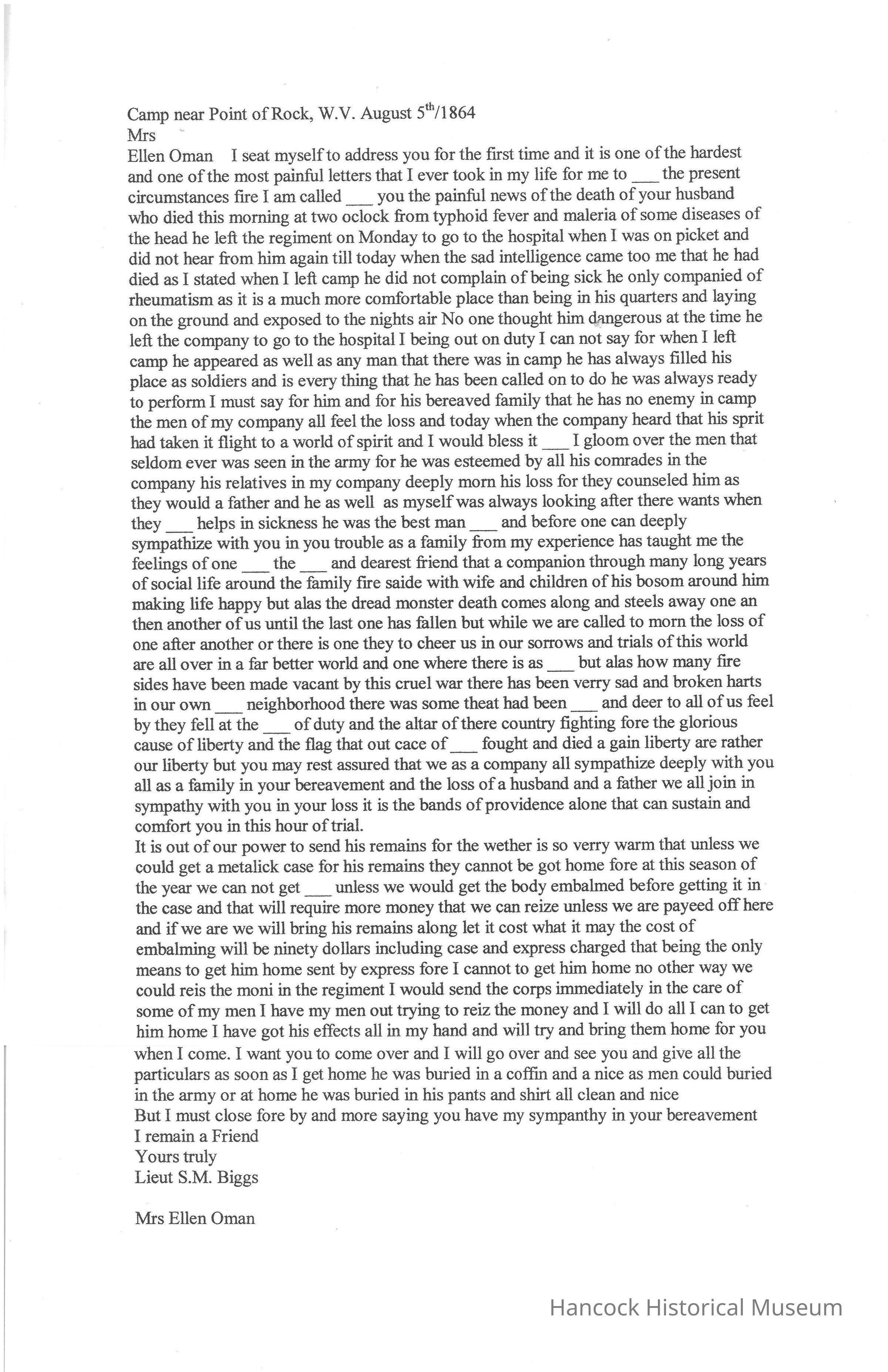 Civil War letter from S M Biggs to Ellen Oman about death of Her husband dated Aug 5, 1864.