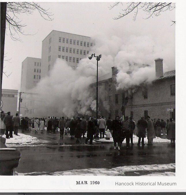View of fire at YMCA, 129 E Sandusky St, Findlay, Oh, with Marathon Oil bldg in background. Taken from NW.