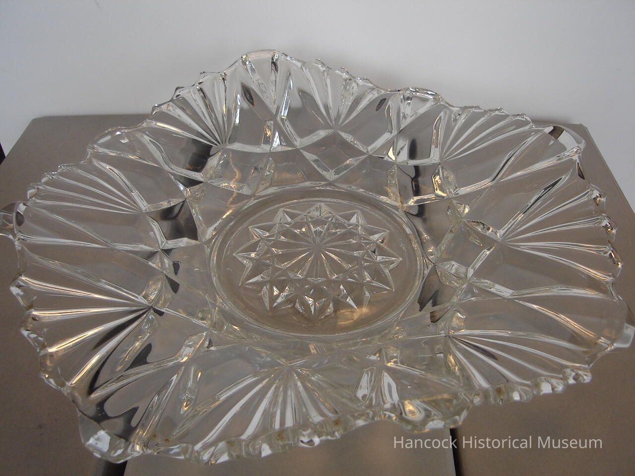 11" clear glass Bevelled Block & Fan pattern plate from Model Flint Glass Co, Findlay, Oh.