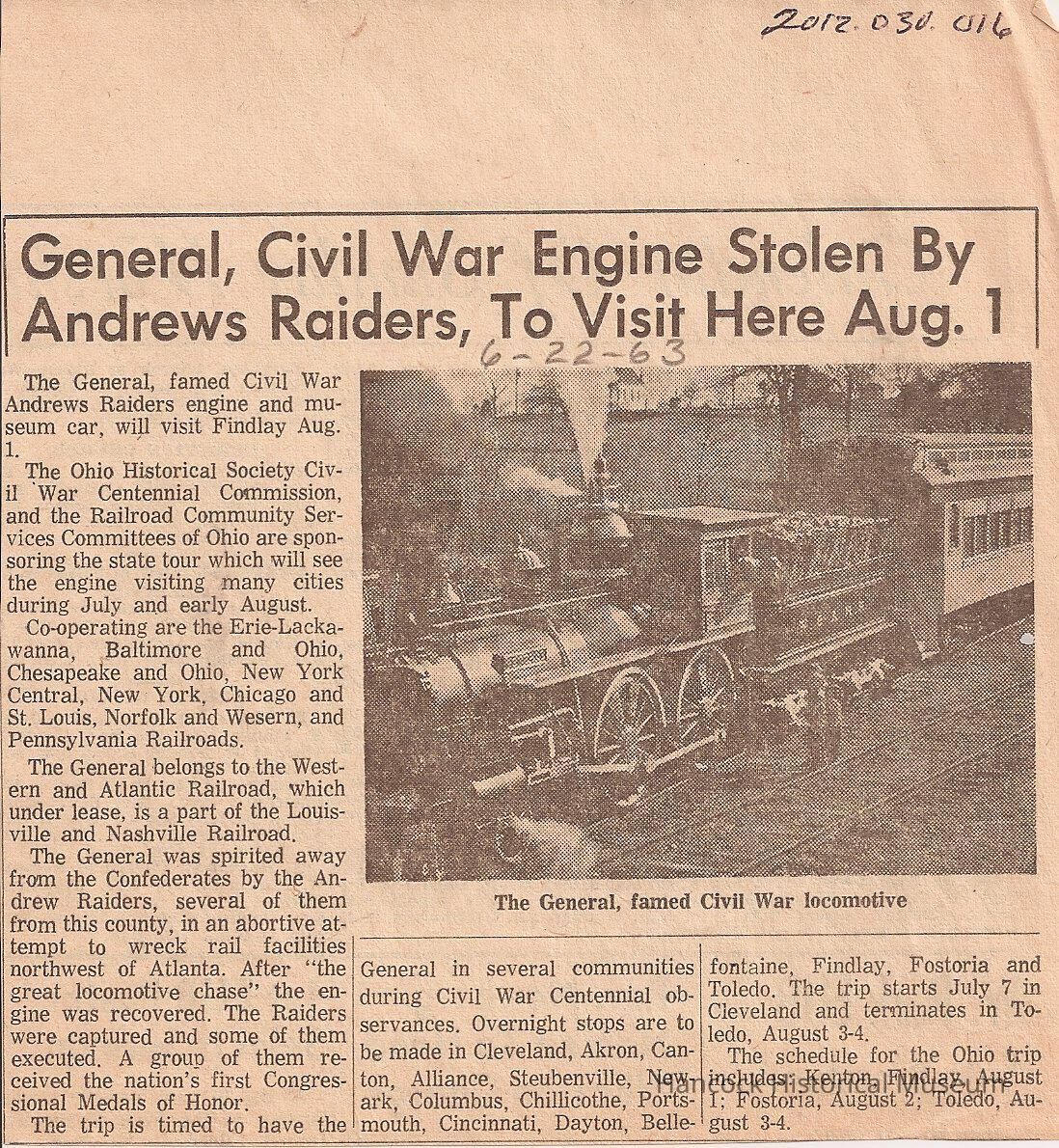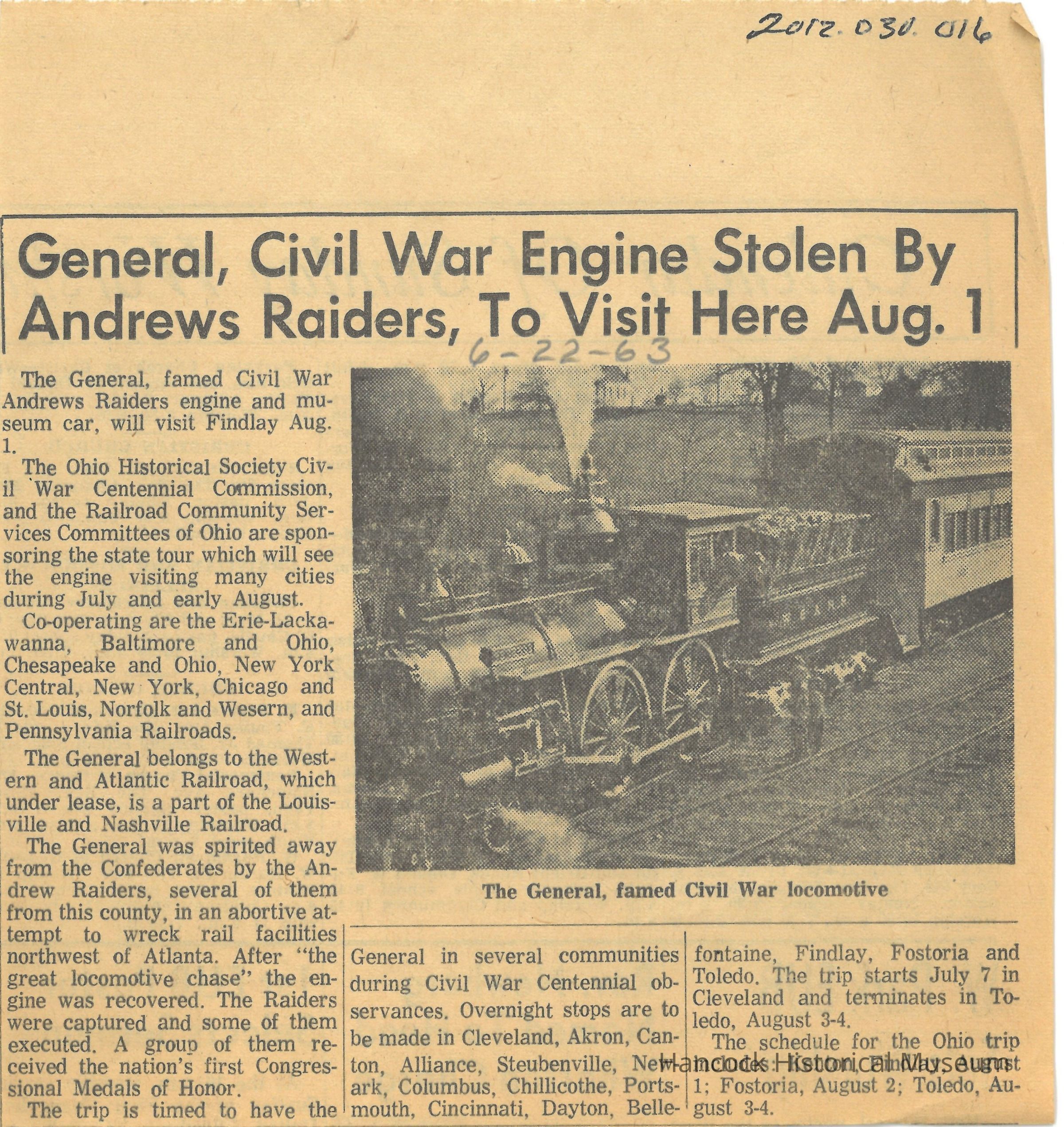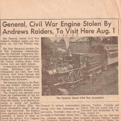 Clipping from the Republican Courier newspaper, Findlay, Oh Jun 22, 1963 about Andrews Raiders and The General locomotive.