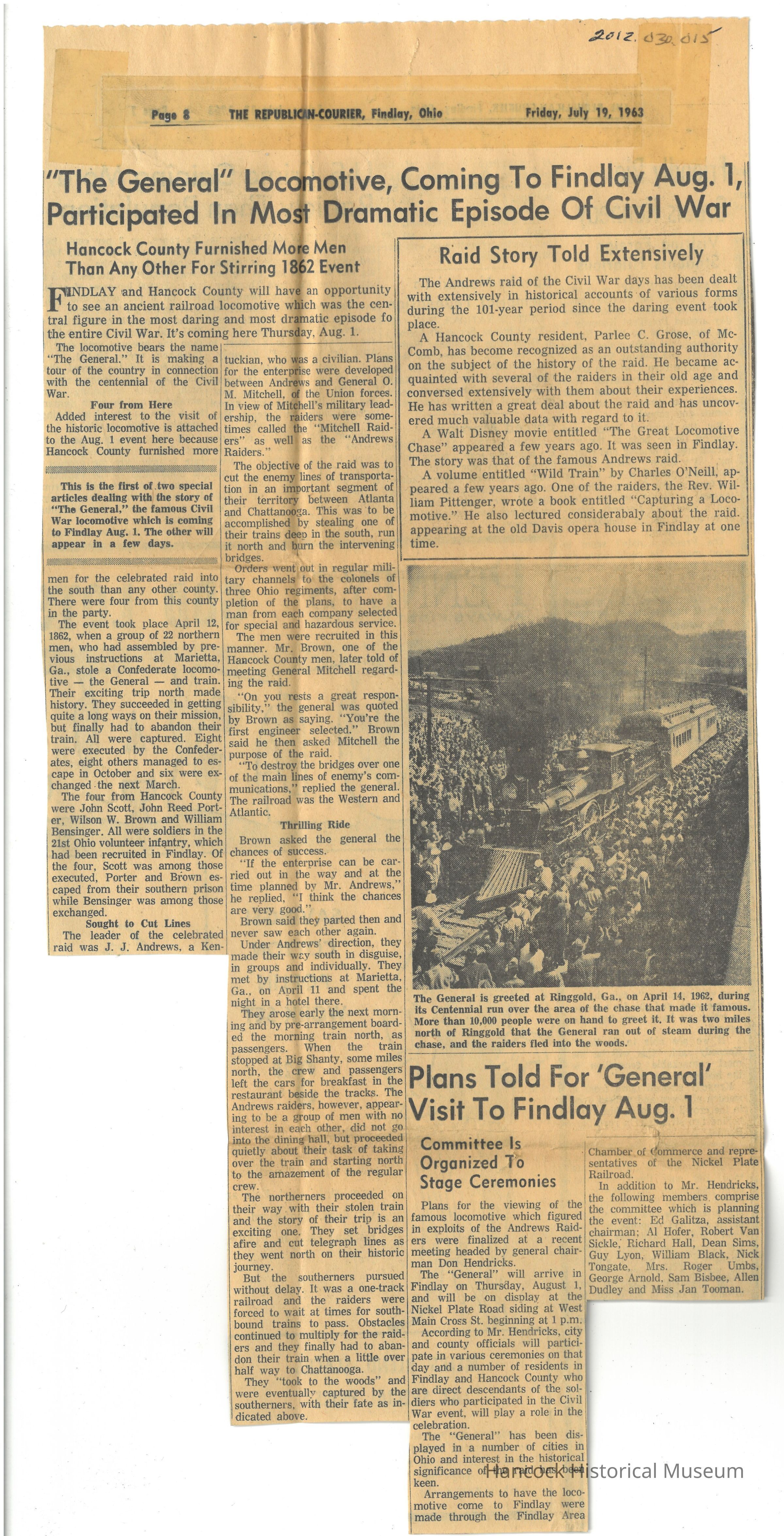 Clipping from The Republican Courier newspaper, Findlay, Oh Jul 19, 1963 about Andrews Raiders & The General locomotive.Collection