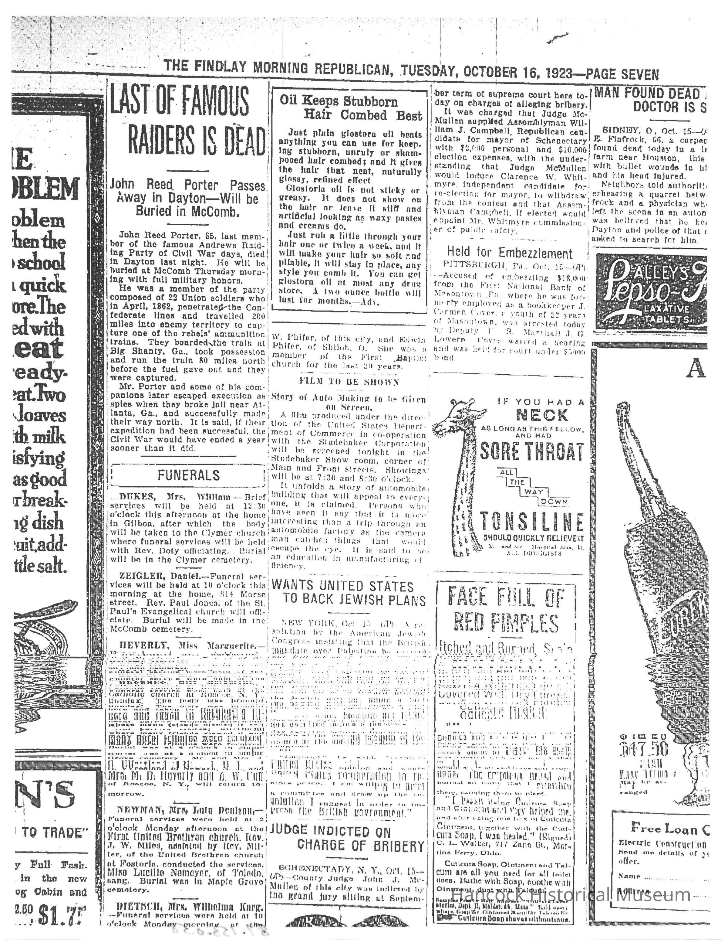 Clipping from The Findlay Morning Republican newspaper, Findlay, Oh, dated oct 16, 1923, about John Reed Porter of Andrews Raiders.Collection