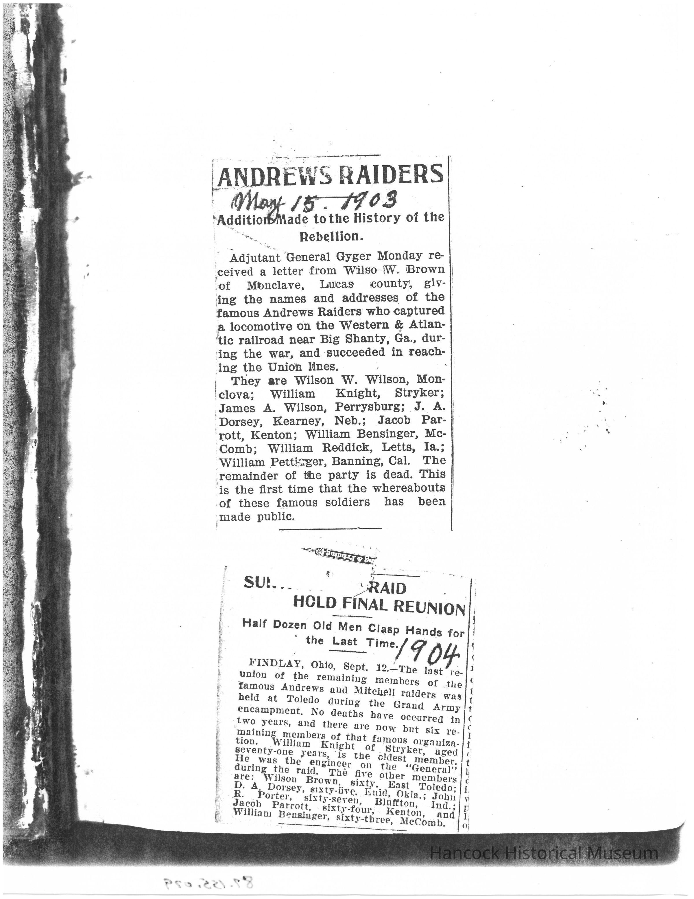 Clippings from newspaper Findlay, Oh on the Andrews Raiders, from May 15, 1903 and 1904.Collection