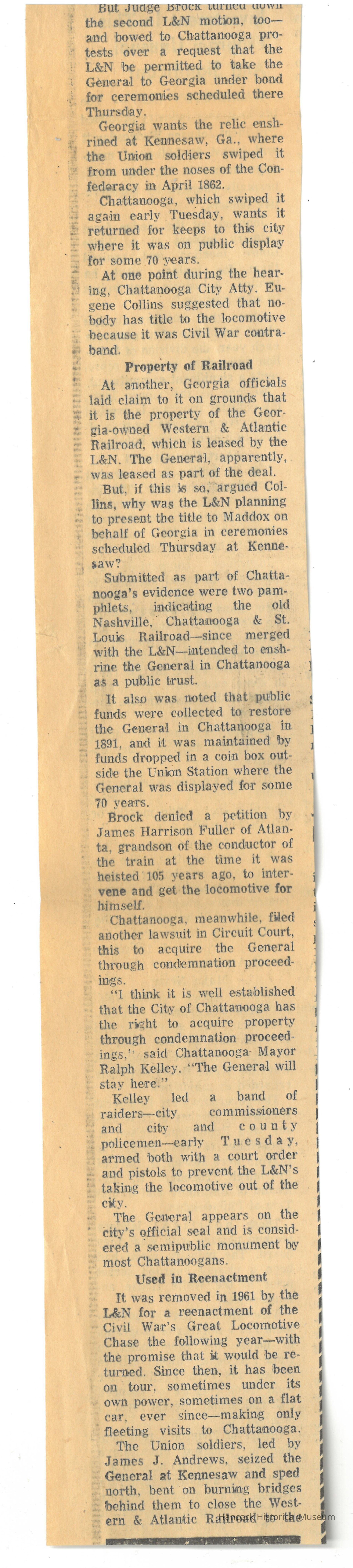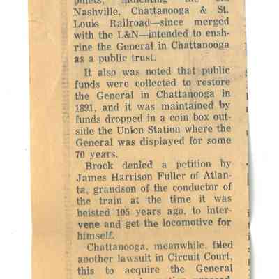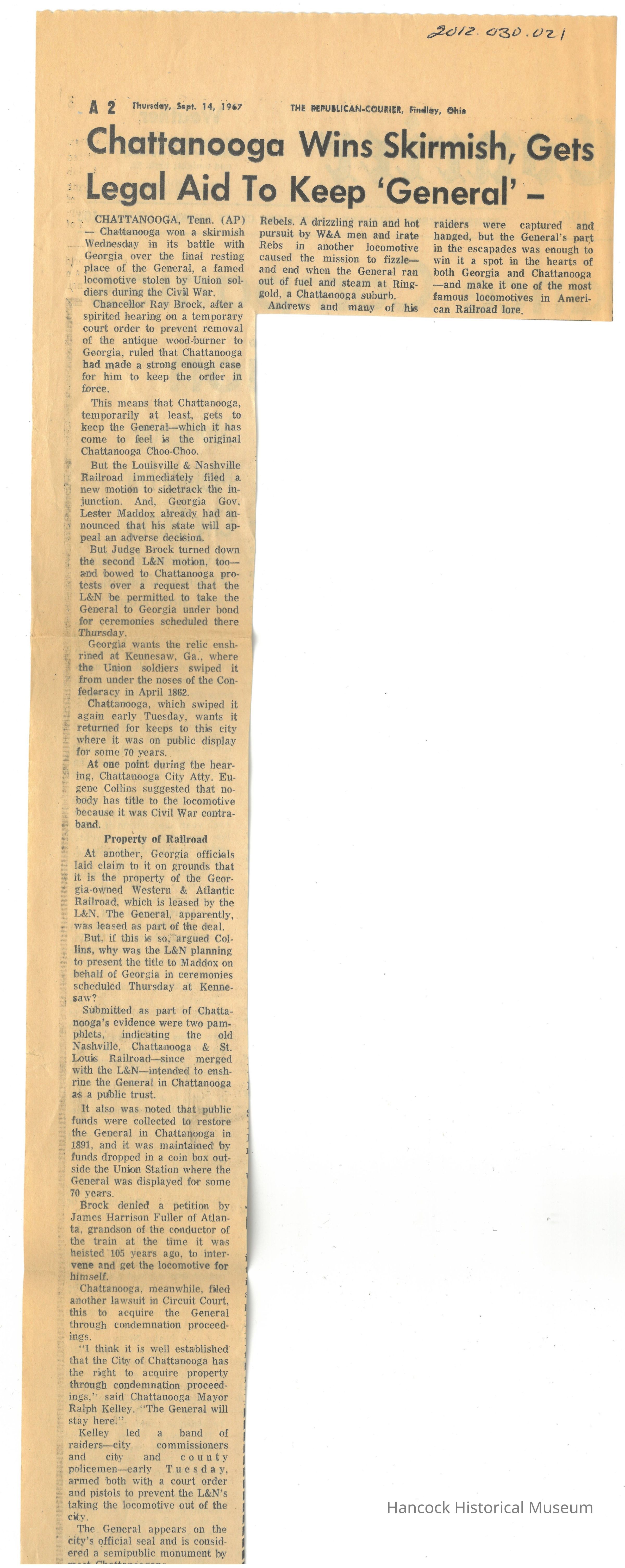 Clipping from The Republican Courier newspaper, Findlay, Oh, Sep 14, 1967 about The General locomotive.Collection