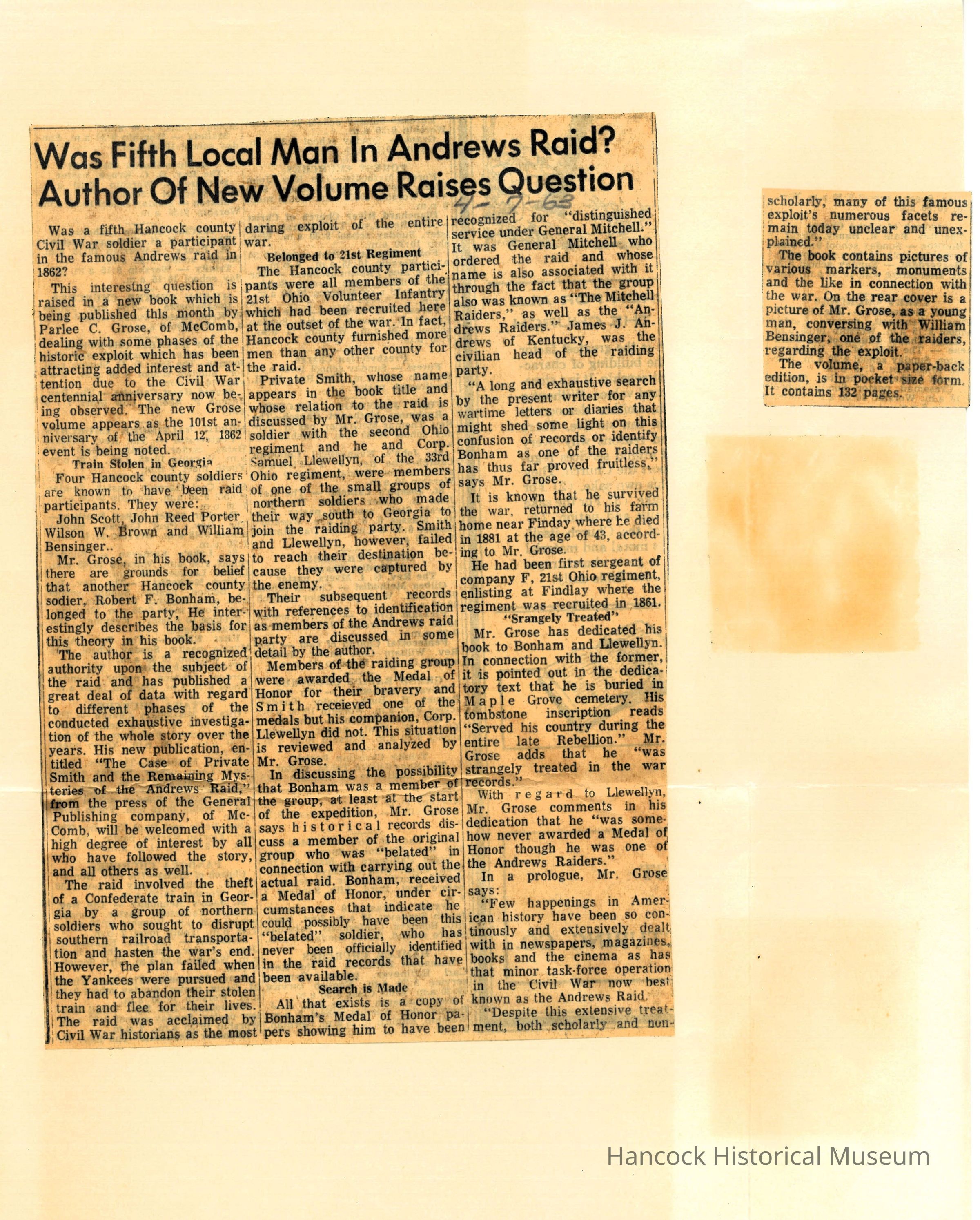 Clipping from The Republican Courier newspaper, Findlay, Oh Jul 7, 1963 about Andrews Raiders in Civil War.Collection