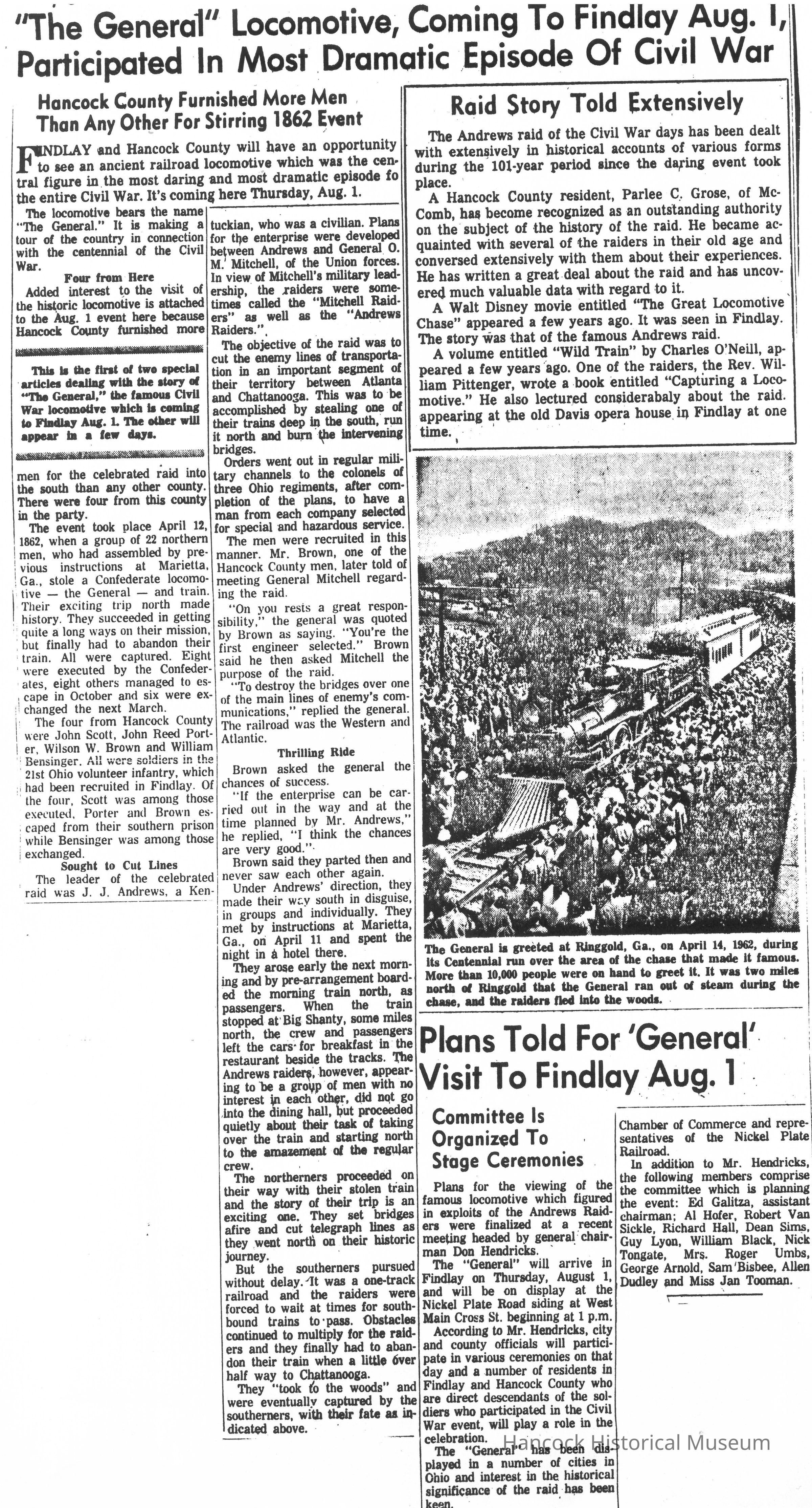 Clipping from The Republican Courier newspaper, Findlay, Oh, dated 1963, on the visit to Findlay, Oh of the General locomotive from the Andrews Raiders.Collection