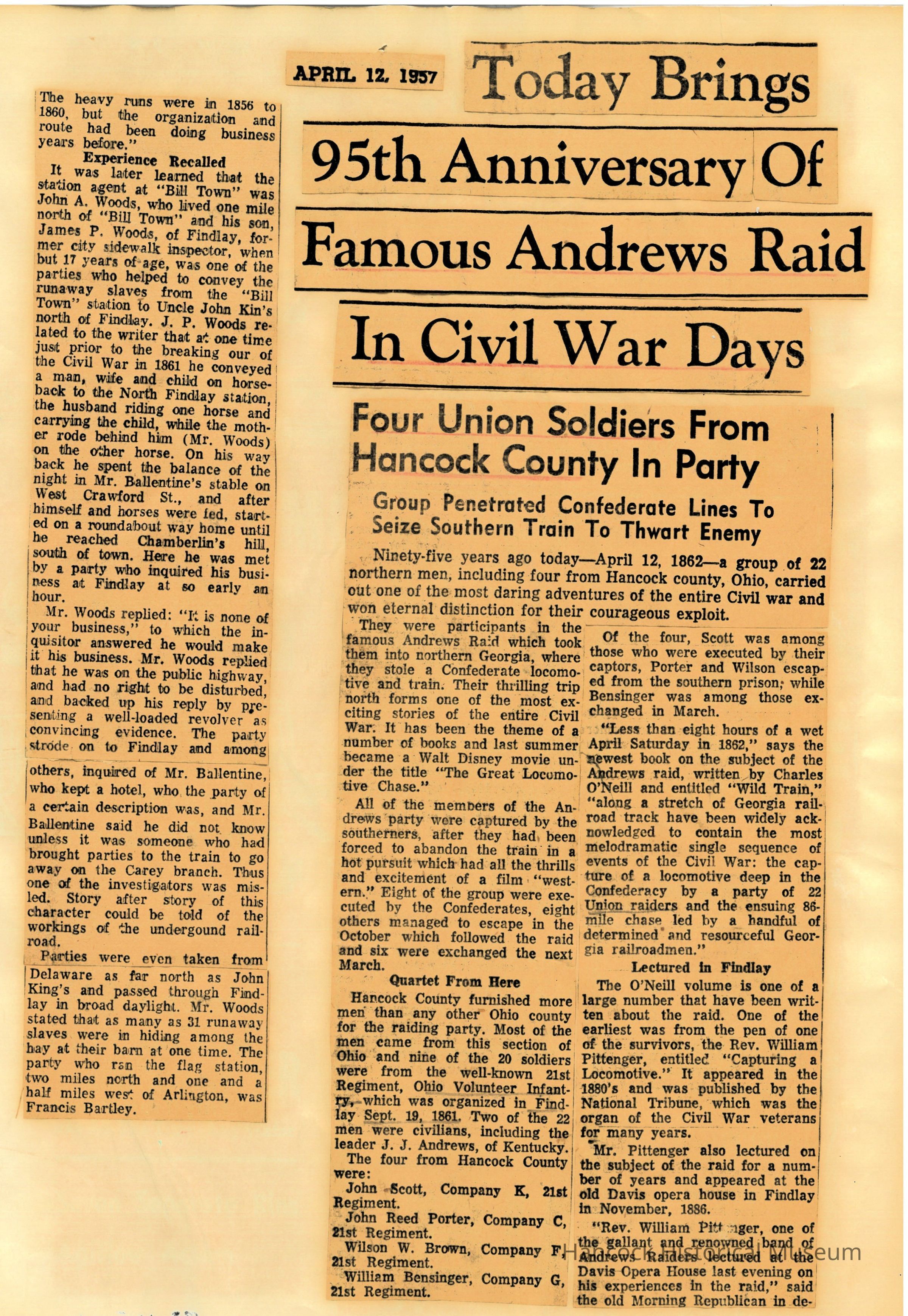 Clippings from The Republican Courier newspaper, Findlay, Oh, dated Apr 12, 1957, on the Andrews Raiders.Collection