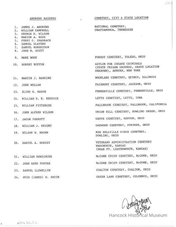 List of the burial sites of the Andrews Raiders, compiled by Dough Byrum, dated Mar 02, 1986.Collection