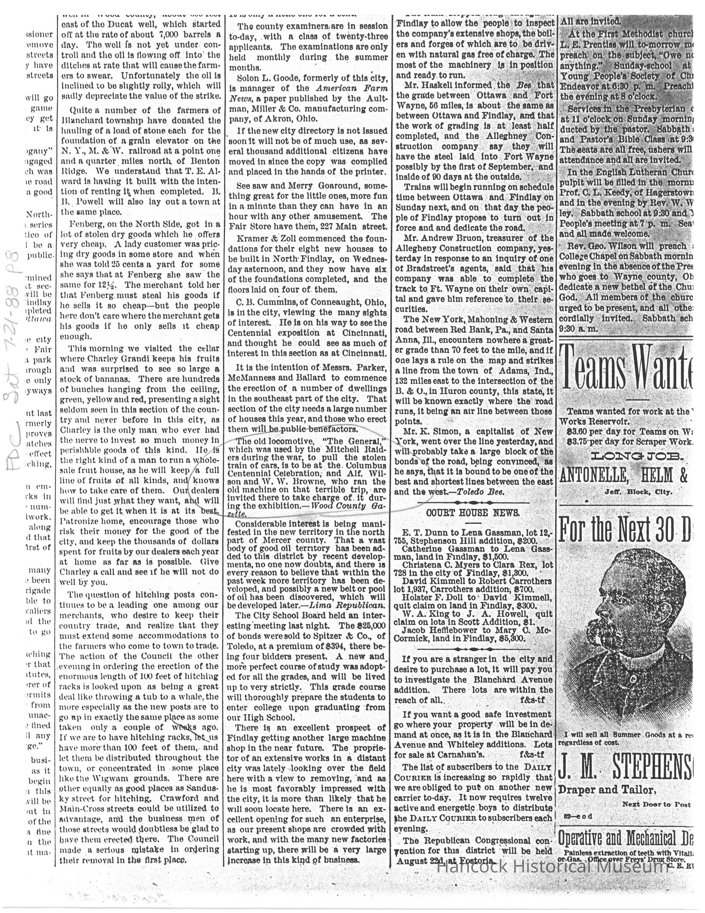 Clipping from Findlay Daily Courier newspaper, Findlay, oh Jul 21, 1888 about Andrews Raiders.Collection