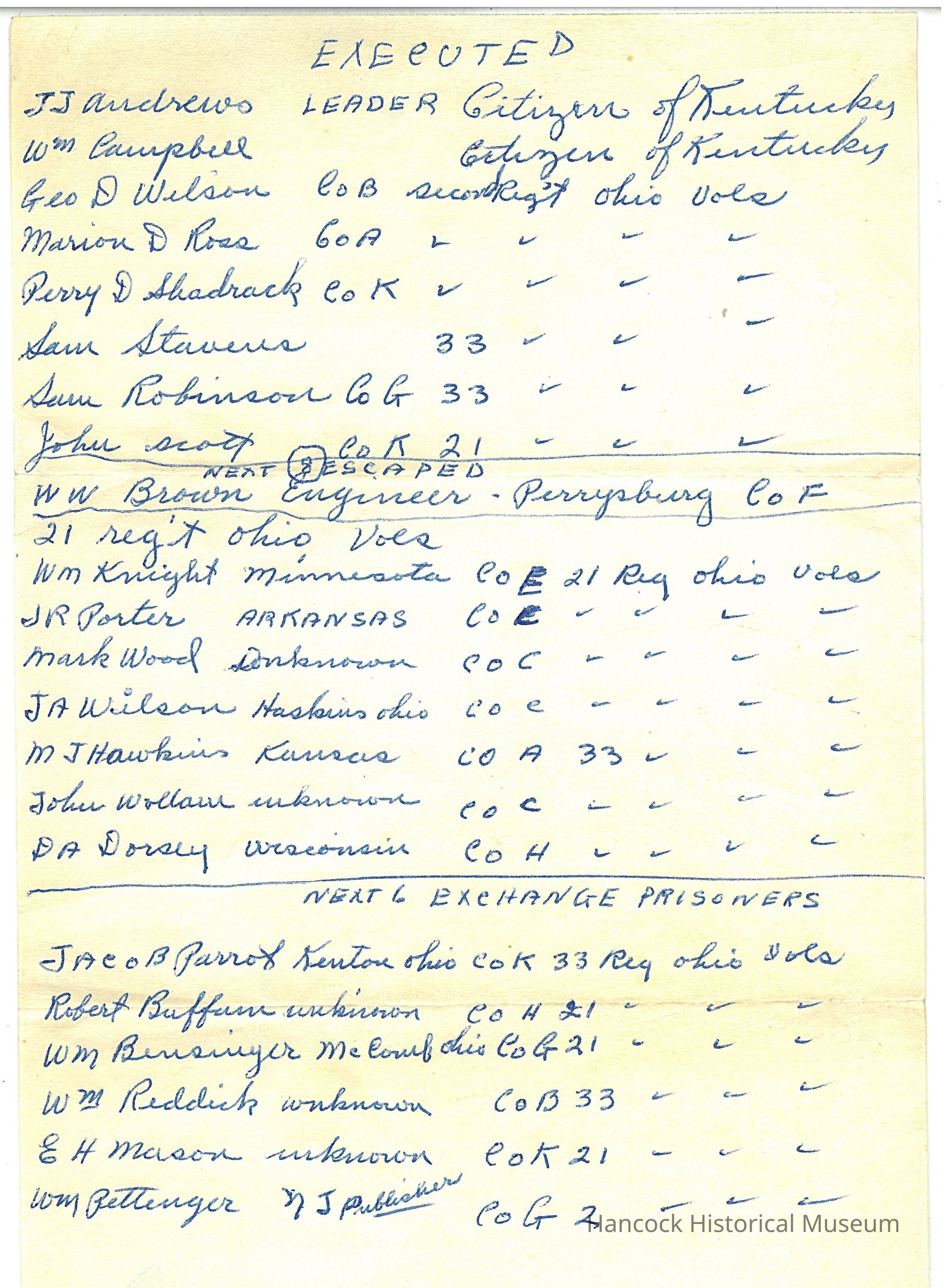 List of the Andrews Raiders and the disposition of them whether executed, escaped or exchanged.Collection