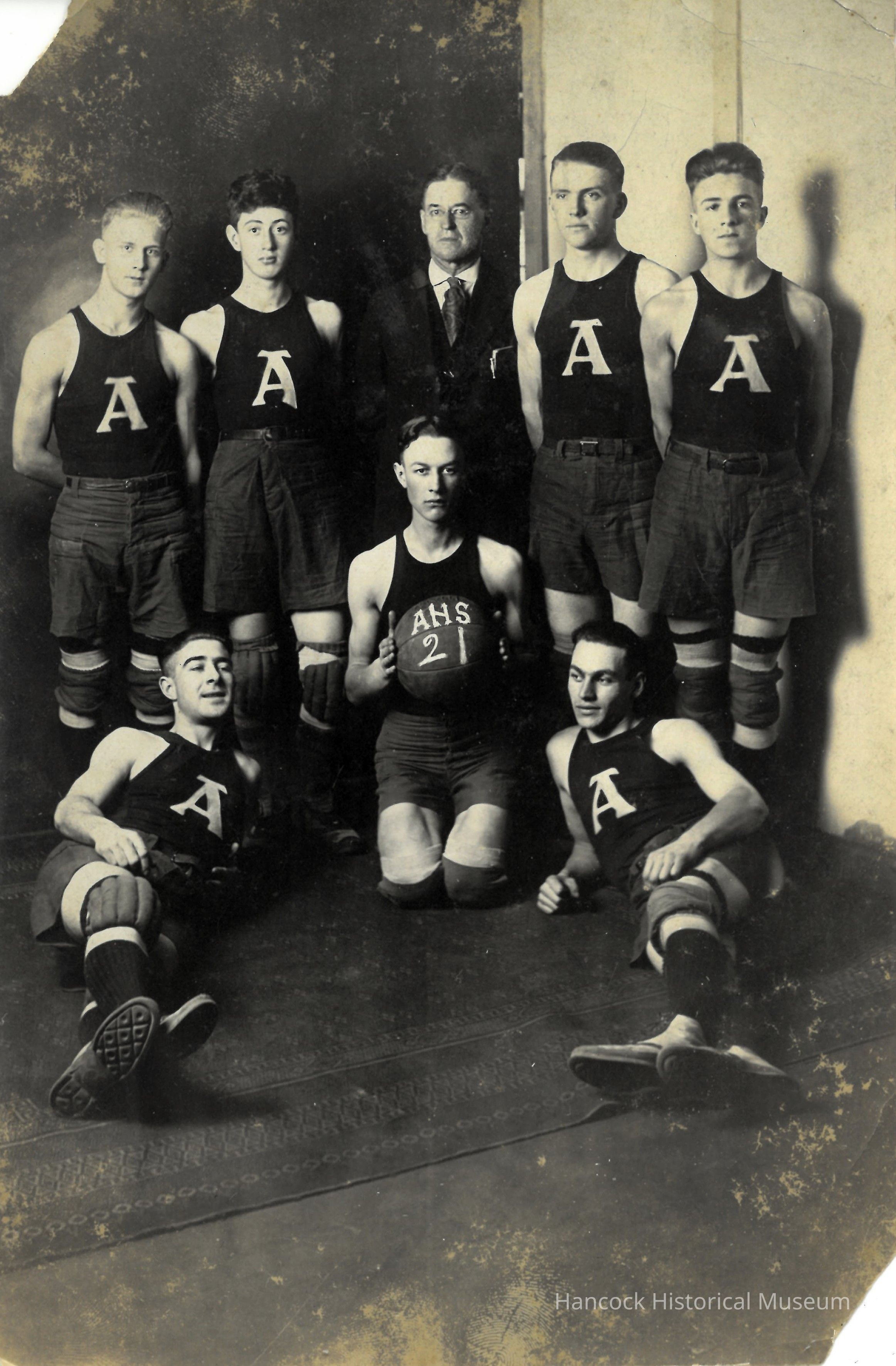 4 x 6 b/w Photograph of an Arlington Basketball team.:Virgil Snyder, Chester Dexter, Mr. Hammond Principal, Max Long, Guy Kimmel, Elsworth Snyder, Robert Solt, Clyde Vail.Photograph Details