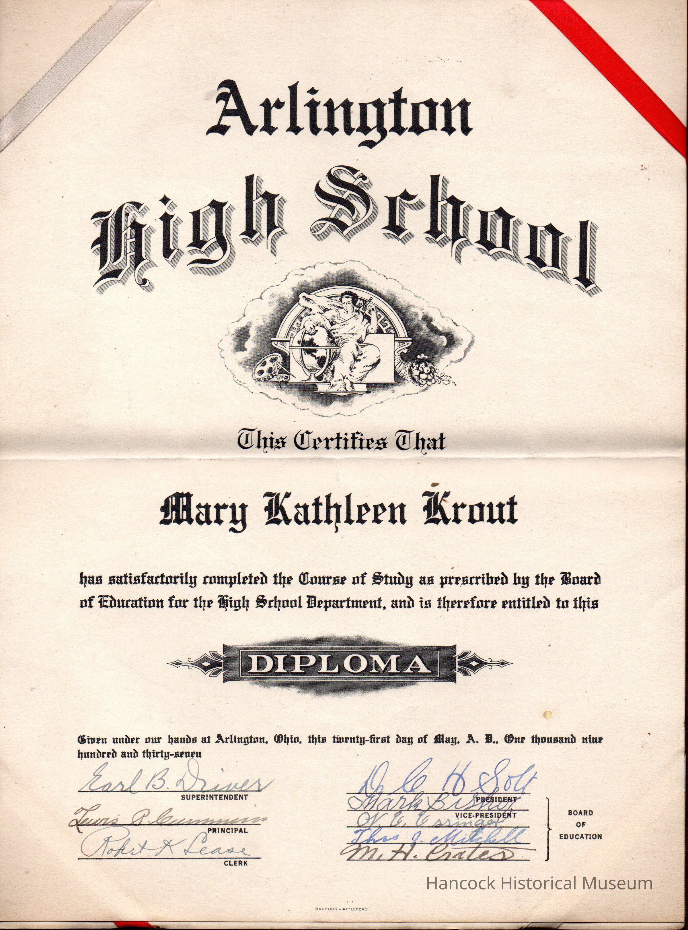 Arlington High School Diploma, Mary Krout 1937Entry/Object ID