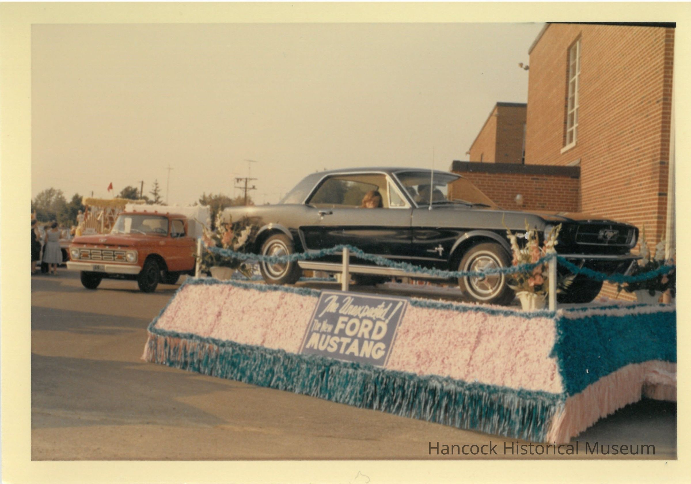 Color photograph of a Ford Mustang on a float in the Arlington Homecoming Parade July 1964