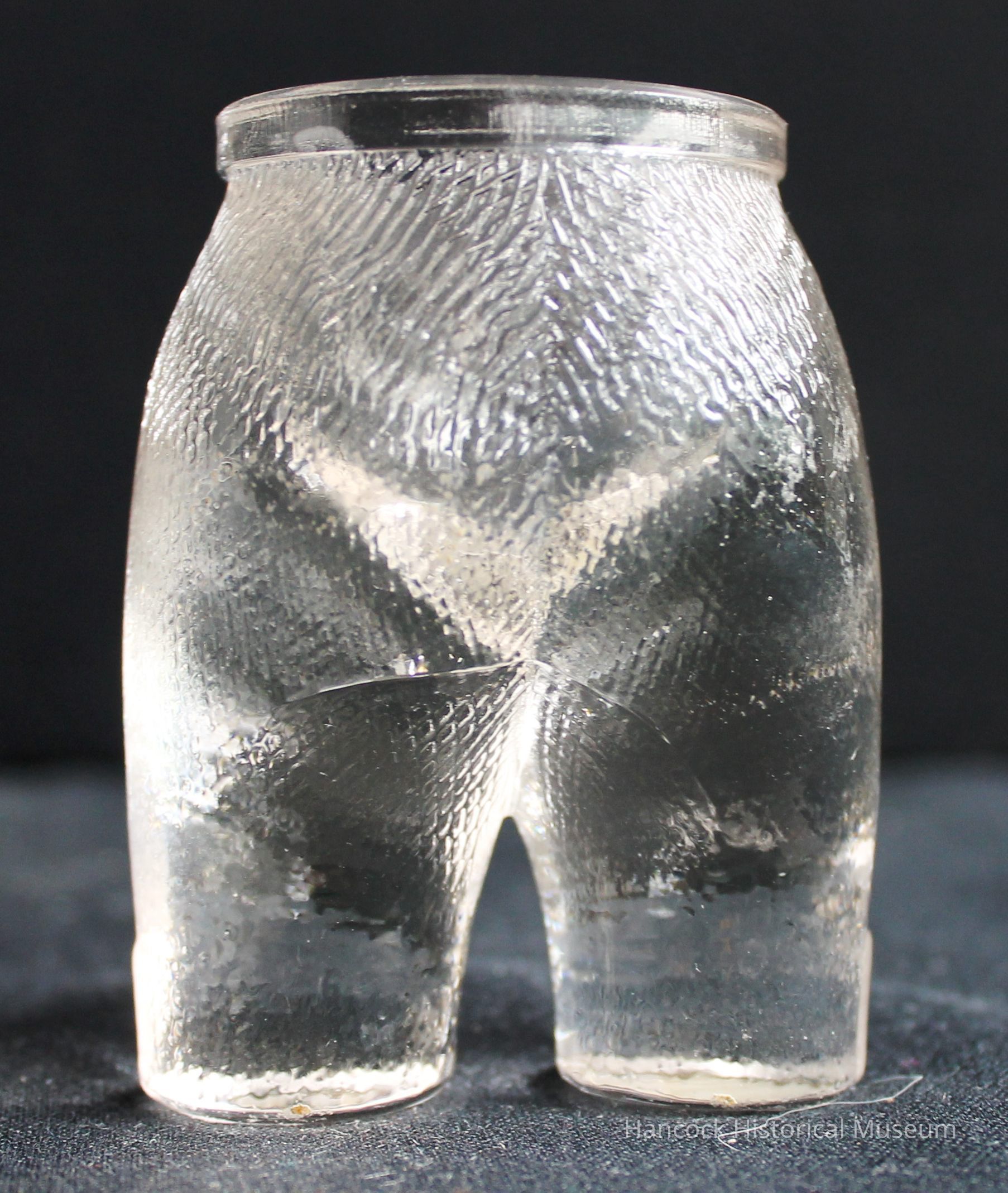 Clear glass toothpick whimsey in the shape of pants made by the Findlay Flint Glass Company in Findlay, Ohio