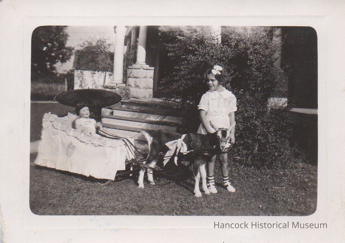 C.T. Parade Girls with calf pulling doll in wagon 1938 Clover Farm Store Picnic