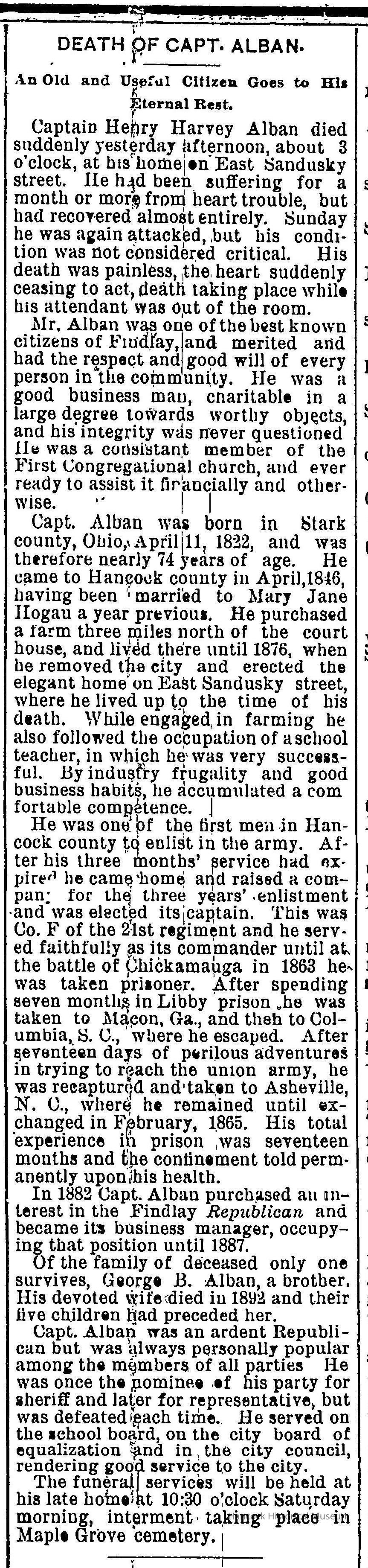 Transcript of obituary of Captain henry Alban January 31, 1895