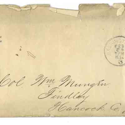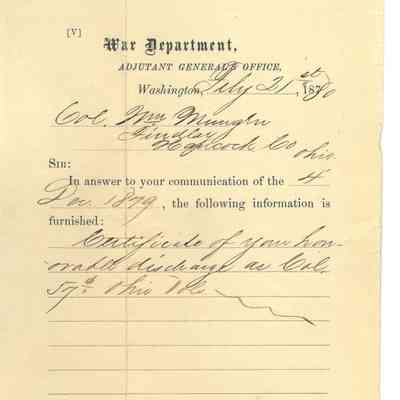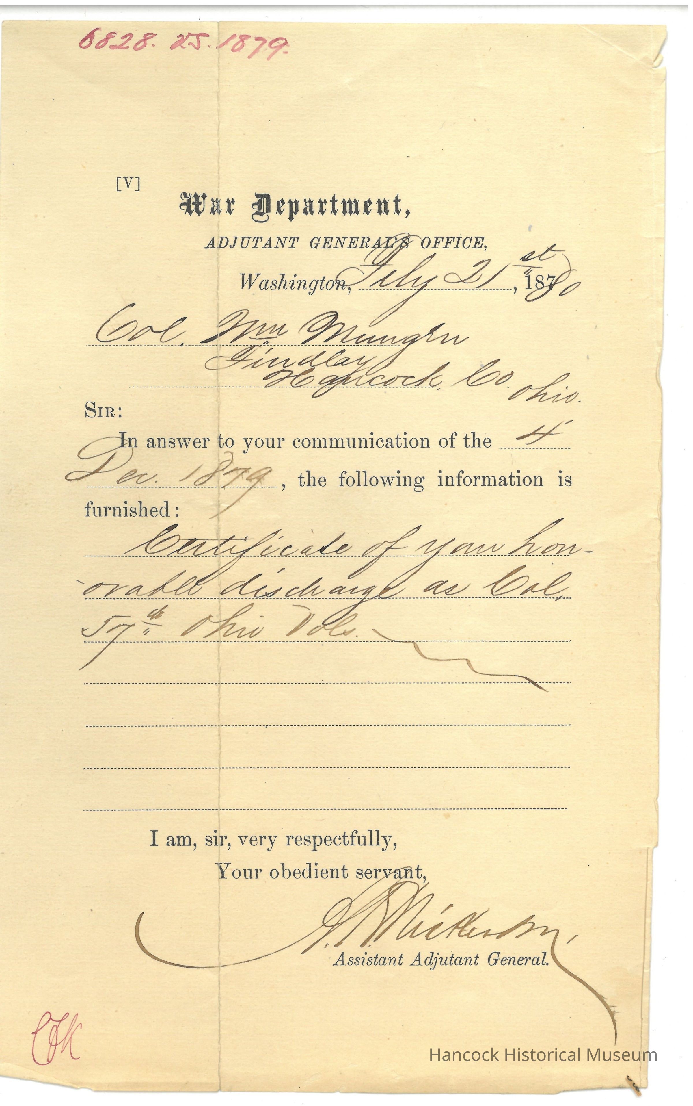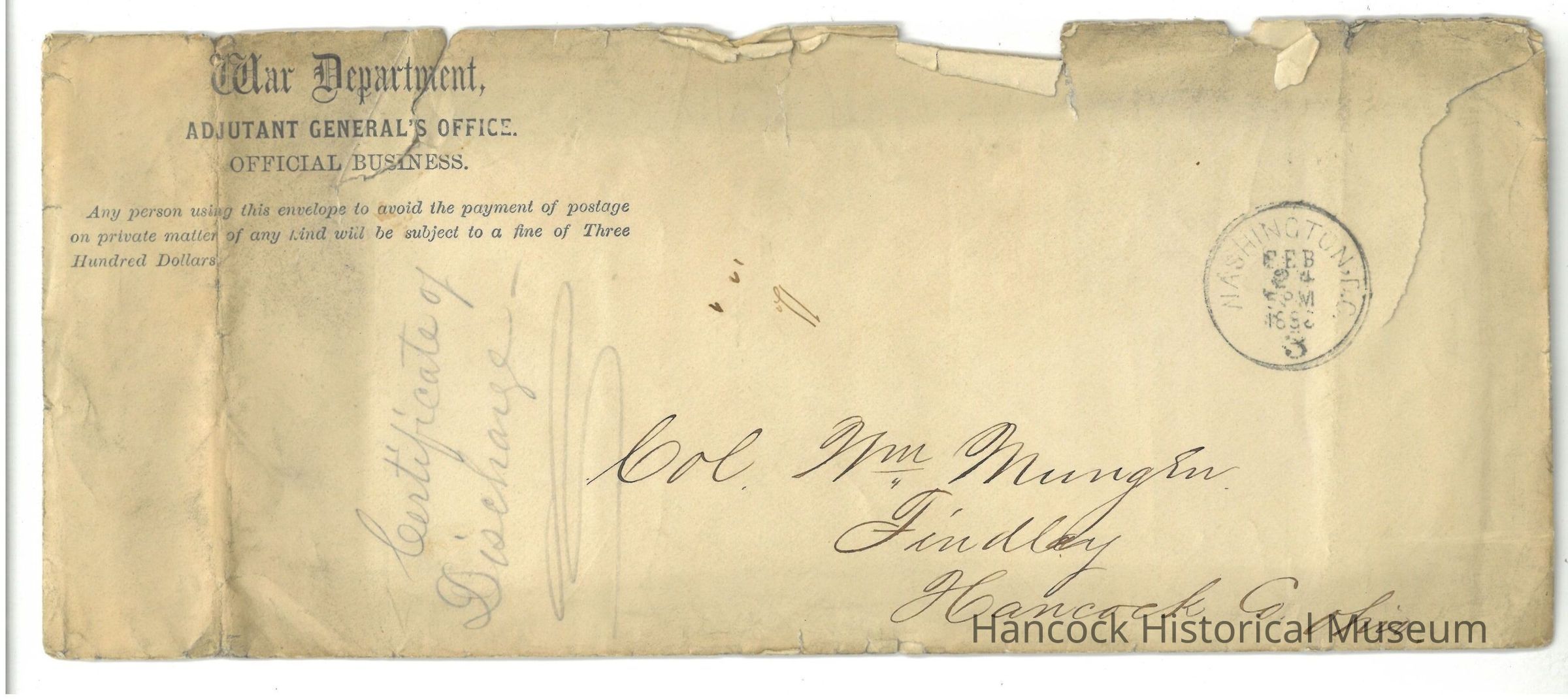 The image shows a vintage, official document titled "Commissioned Officer's Certificate of Honorable Discharge." It features an emblem of an eagle with the motto "E Pluribus Unum" above its head. The document is printed in a decorative font and is addressed to individuals concerned, indicating that William Mungen of Findlay, Hancock County, Ohio, has applied for and is granted a certificate of honorable discharge from the United States military service. He held the rank of Colonel in the 57th Regiment of Ohio Infantry Volunteers. The discharge is dated April 16, 1863. The document states that this certificate serves as evidence of the original discharge being lost or destroyed and is not valid as a financial voucher. It is issued by the Adjutant General's Office, War Department, Washington, D.C., signed by the Assistant Adjutant General on April 21, 1864.