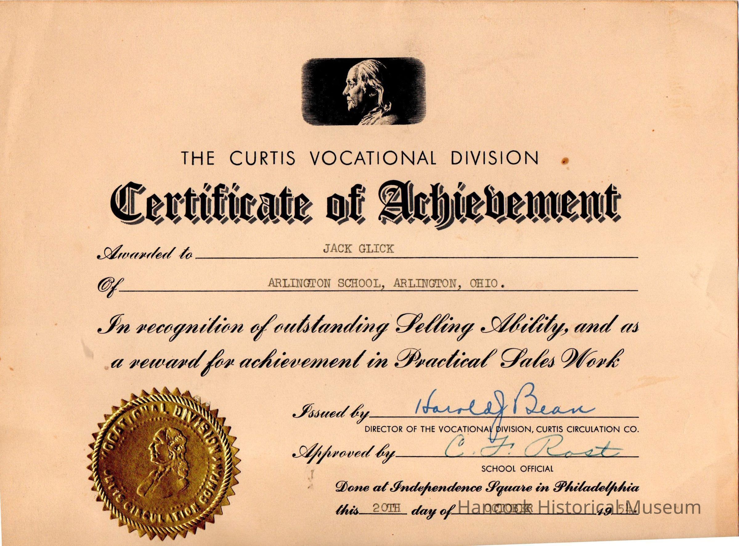 Certificate Of Achievement, Jack GlickEntry/Object ID