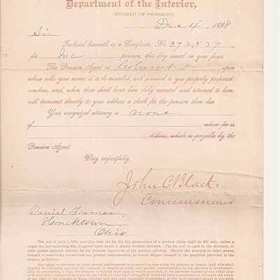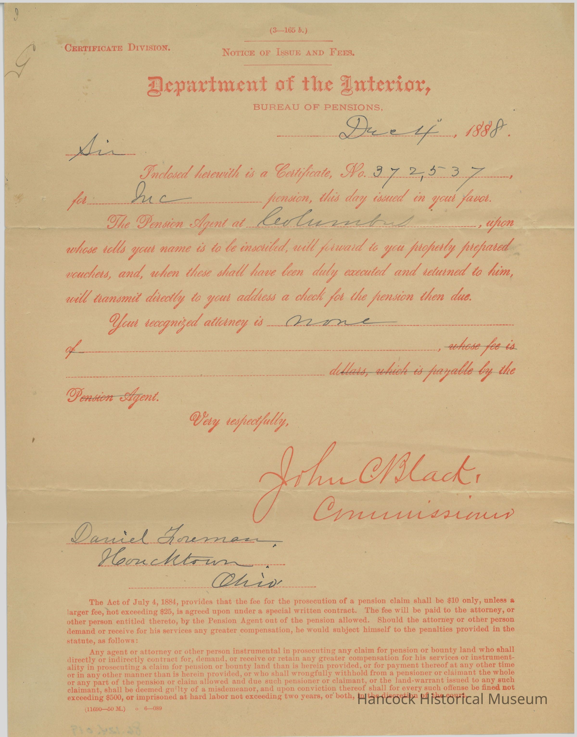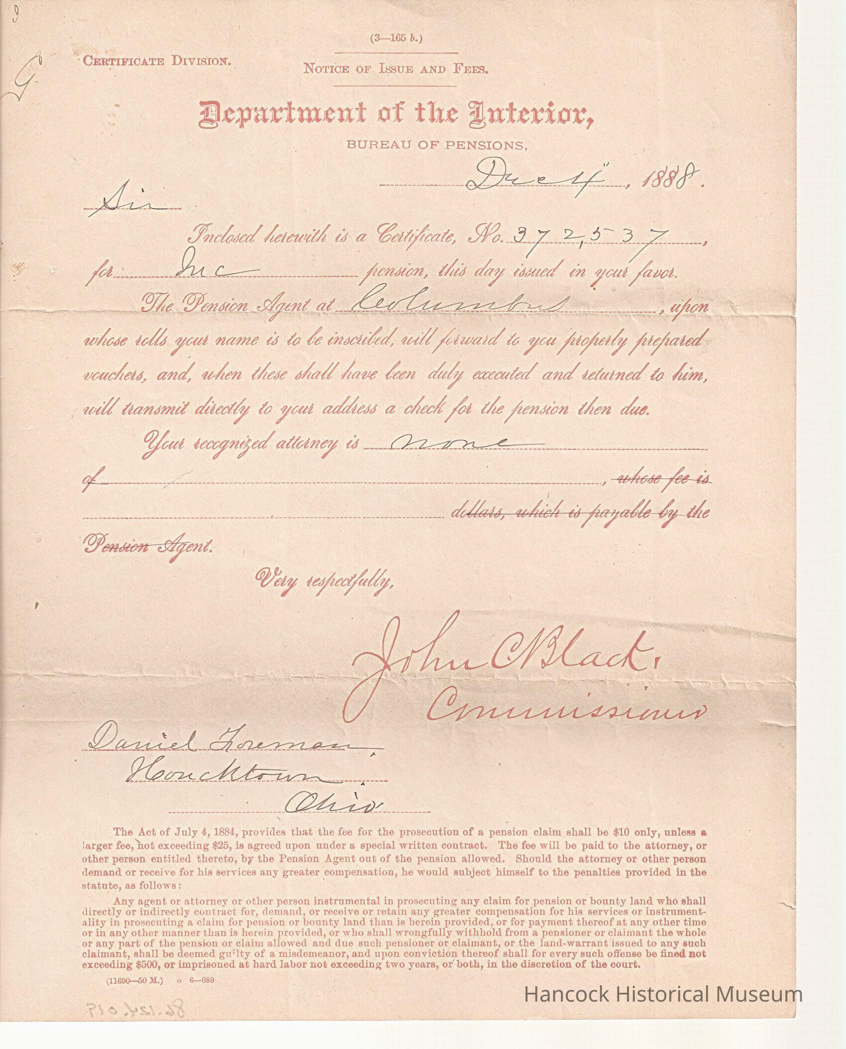 The image shows an official letter from the Department of the Interior, Bureau of Pensions, dated December 4, 1888. The letter, addressed to Daniel Freeman of Hometown, Ohio, includes a notice of a pension certificate, number 272537, issued that day in the recipient’s favor. It instructs that the Pension Agent at Columbus will manage related matters and send prepared vouchers which, once executed and returned, will allow the recipient to receive a pension check. The letter specifies that the authorized attorney for the recipient is noted as "none," and it discusses fees related to the prosecution of pension claims, stating rules governed by an act passed on July 4, 1884. The letter is signed by John C. Black, with detailed provisions about attorney involvement and penalties for misconduct highlighted at the bottom.
