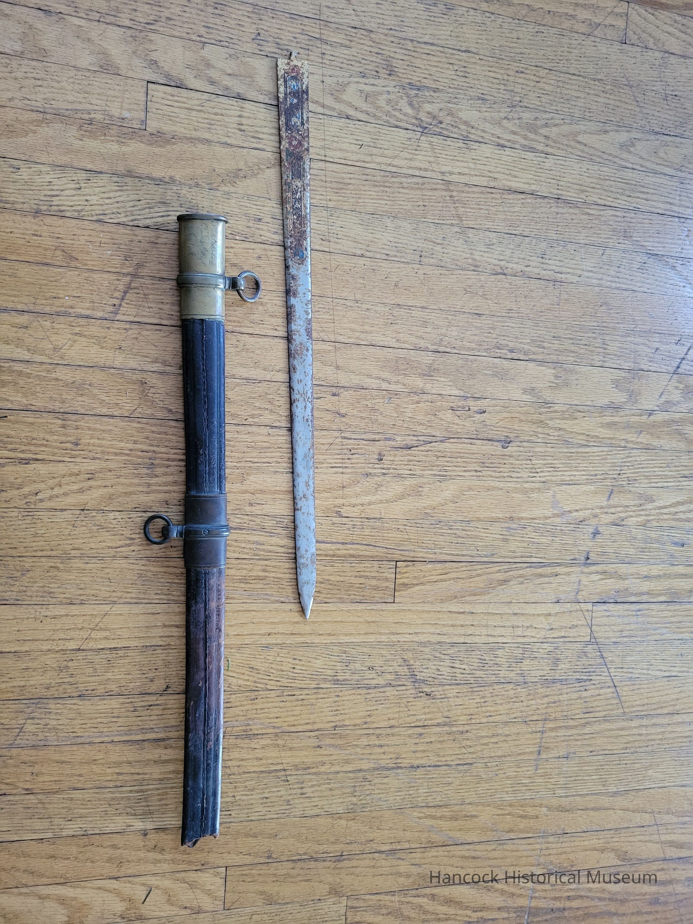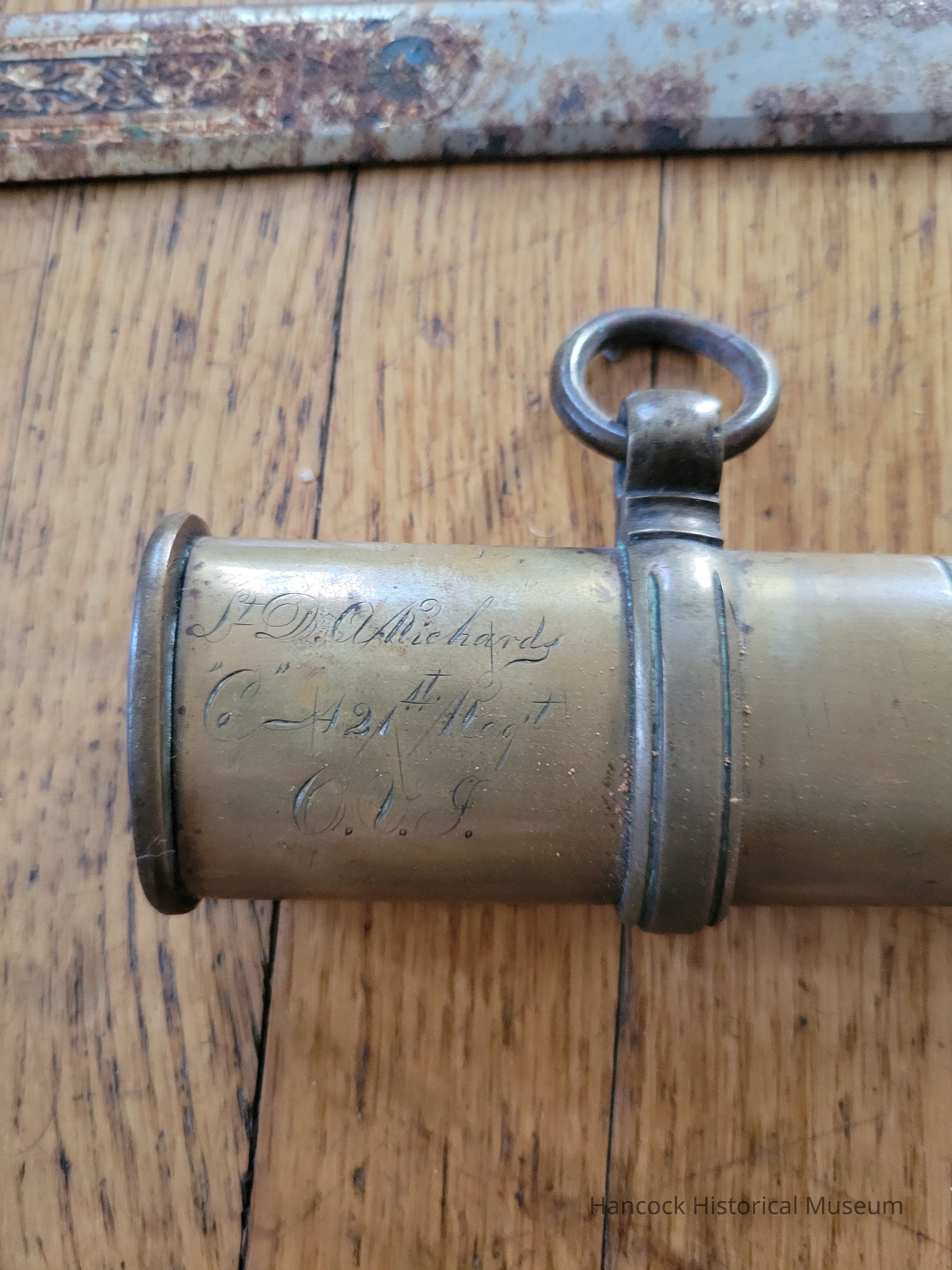 21" brass & leather sword scabbard from 1st Lt D Richards 21st Regiment OVI. Scabbard is broken off and has a sword blade inside to keep from flaking off more. Model 1850 Foot Officers scabbard engraved. Daniel Richards was Co A 21st OVI, who fought from 9/14/1861 to Feb 29, 1864.Collection