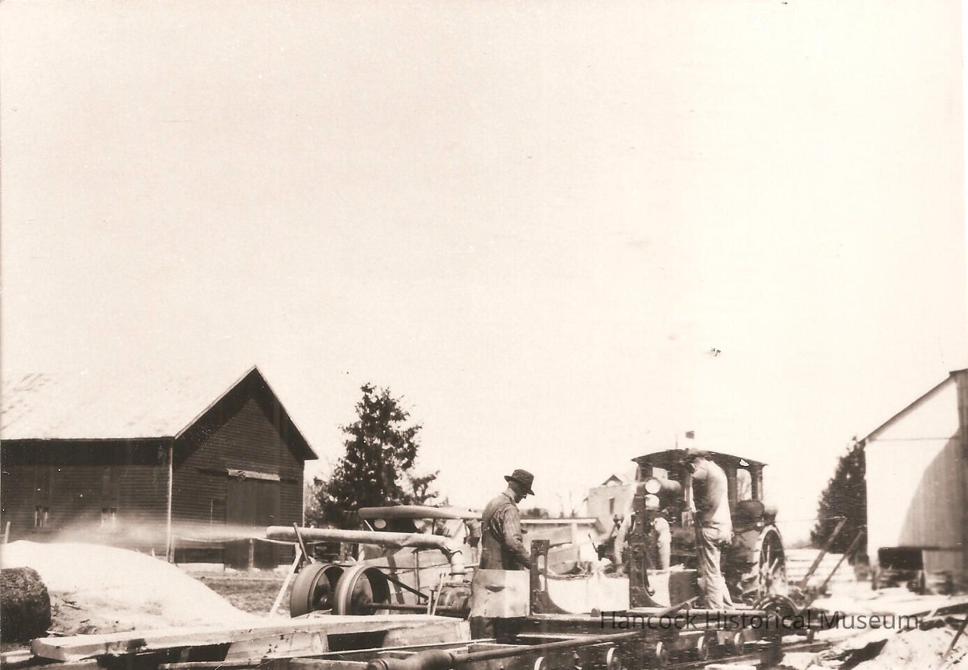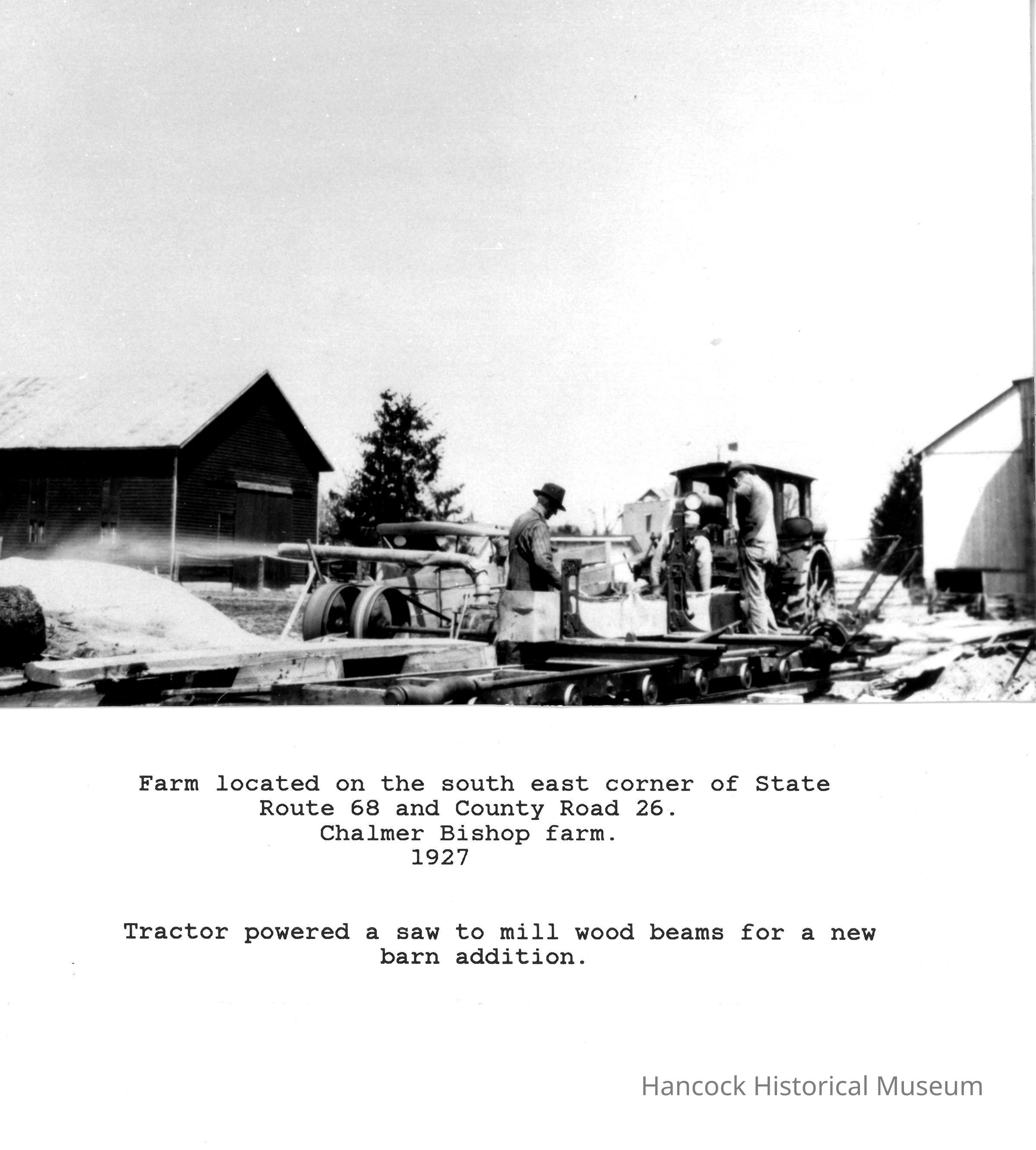 5 x 7 b/w photo of the Chalmer Bishop farm on SE corner of SR 68 & CR 26 in Hancock County, Oh showing a tractor powered saw milling wood for a new barn addition on the farm in 1927. This photo was reproduced by David G Bishop in Jan 1996.Photograph Details