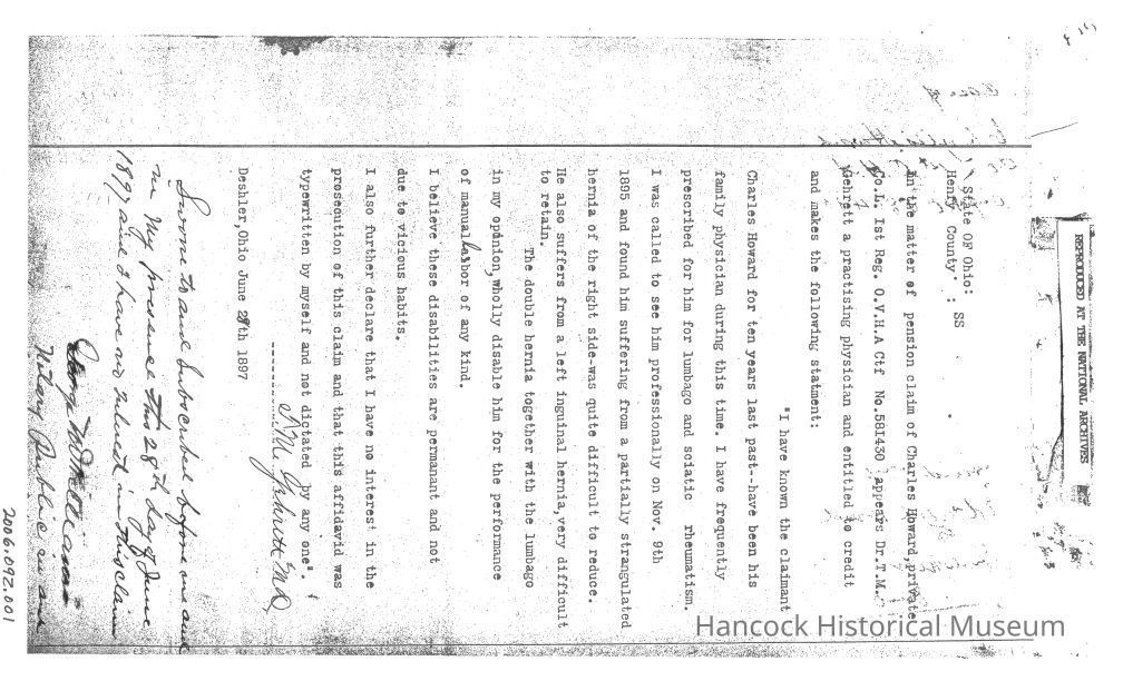 Military and Pension records for Cpl. Charles Howard (1838-1922), 1st Ohio Vol. Heavy Artillery. Howard was from the McComb area.Collection
