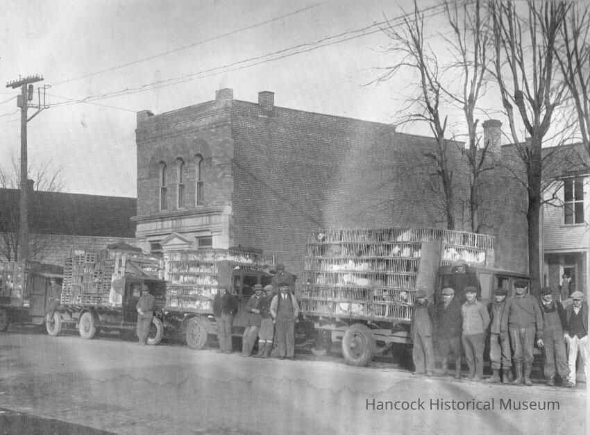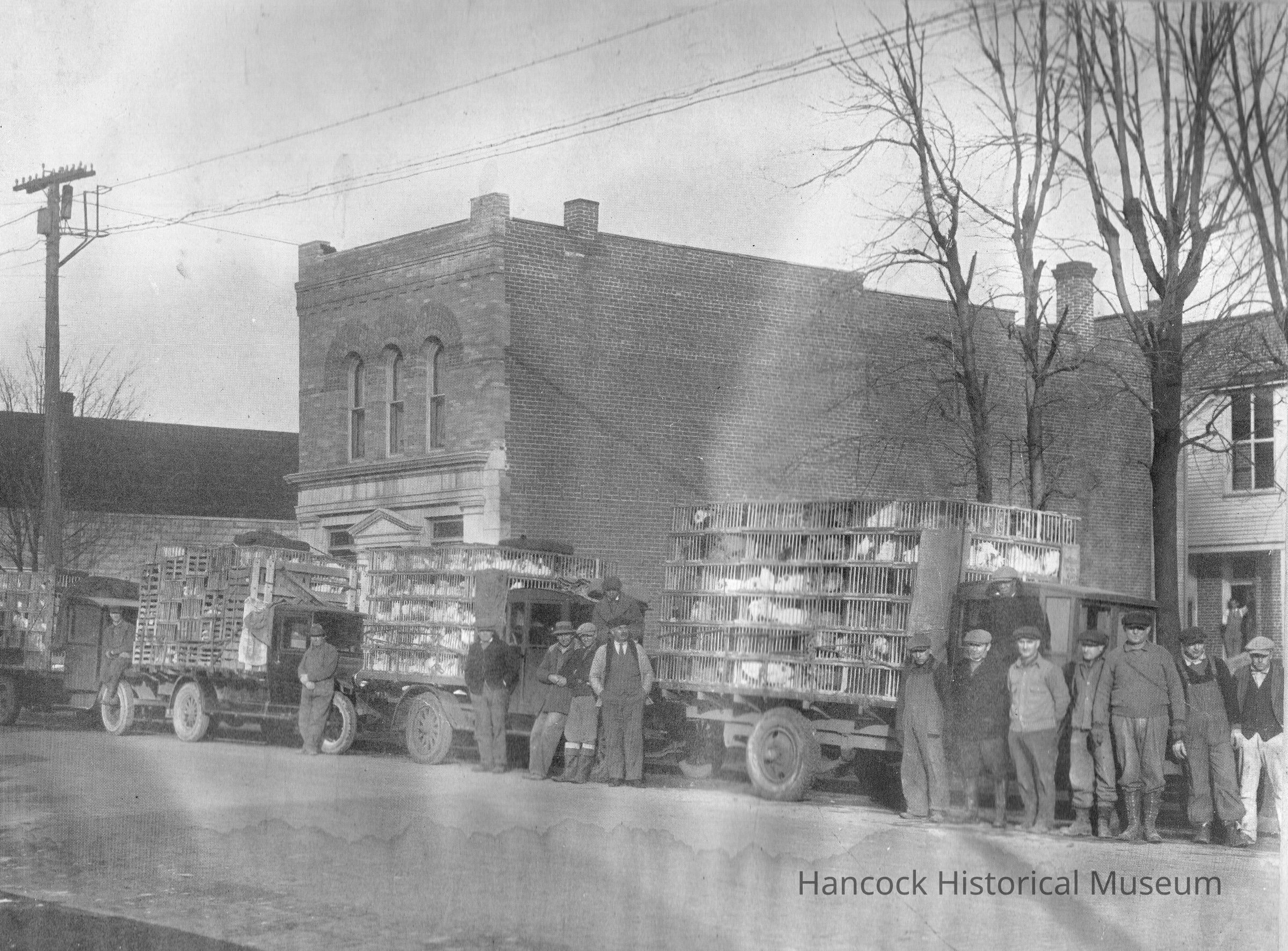Photo of the 100 Block of South Main street at the corner of South Main and Liberty in Arlington. Features truckloads of Chickens. C 1920 Men are standing next to the trucks