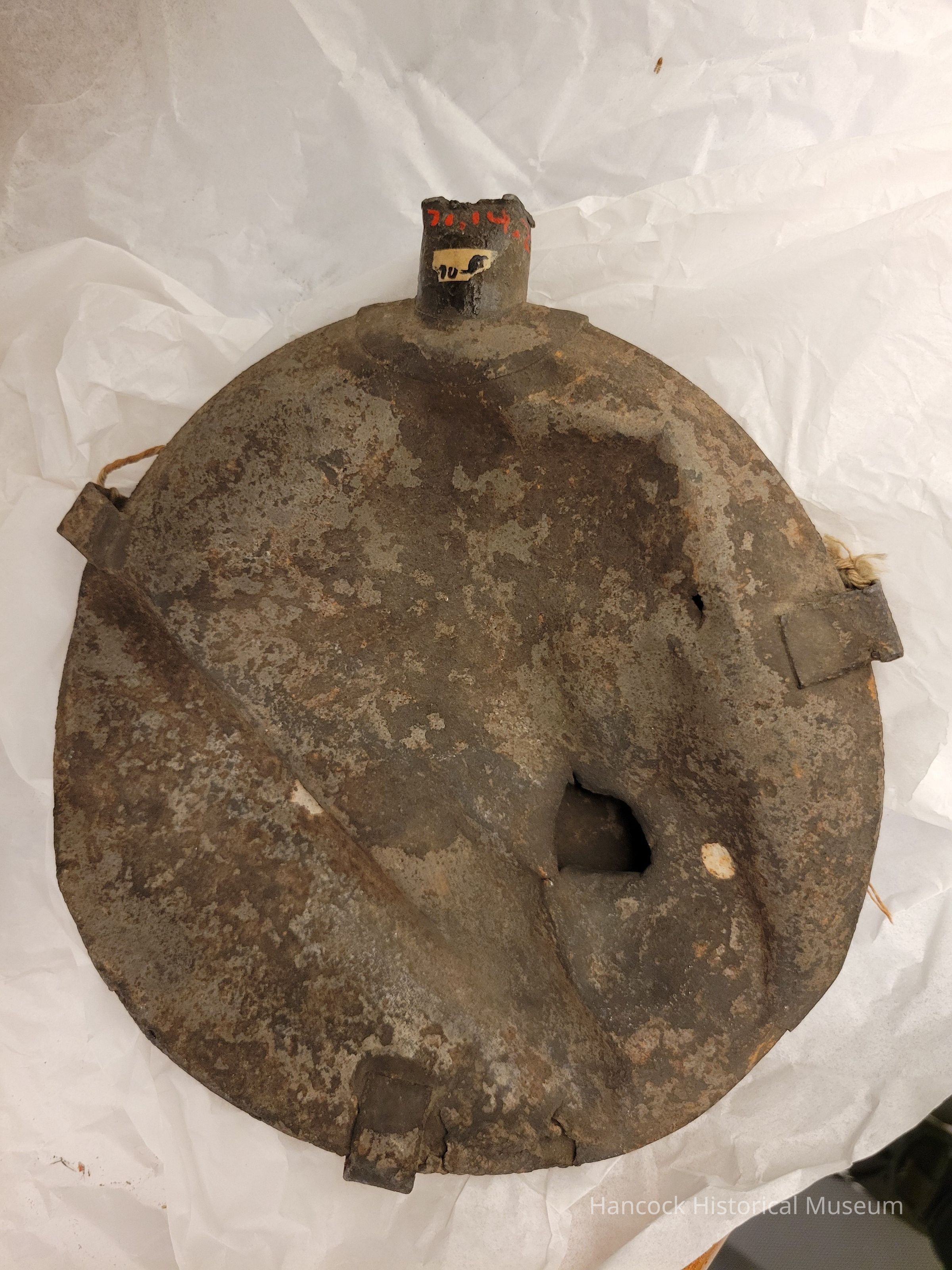 8" round Civil war canteen w/bullet hole in and out and wagon wheel indentations. No Straps or cap. battlefield pick up.