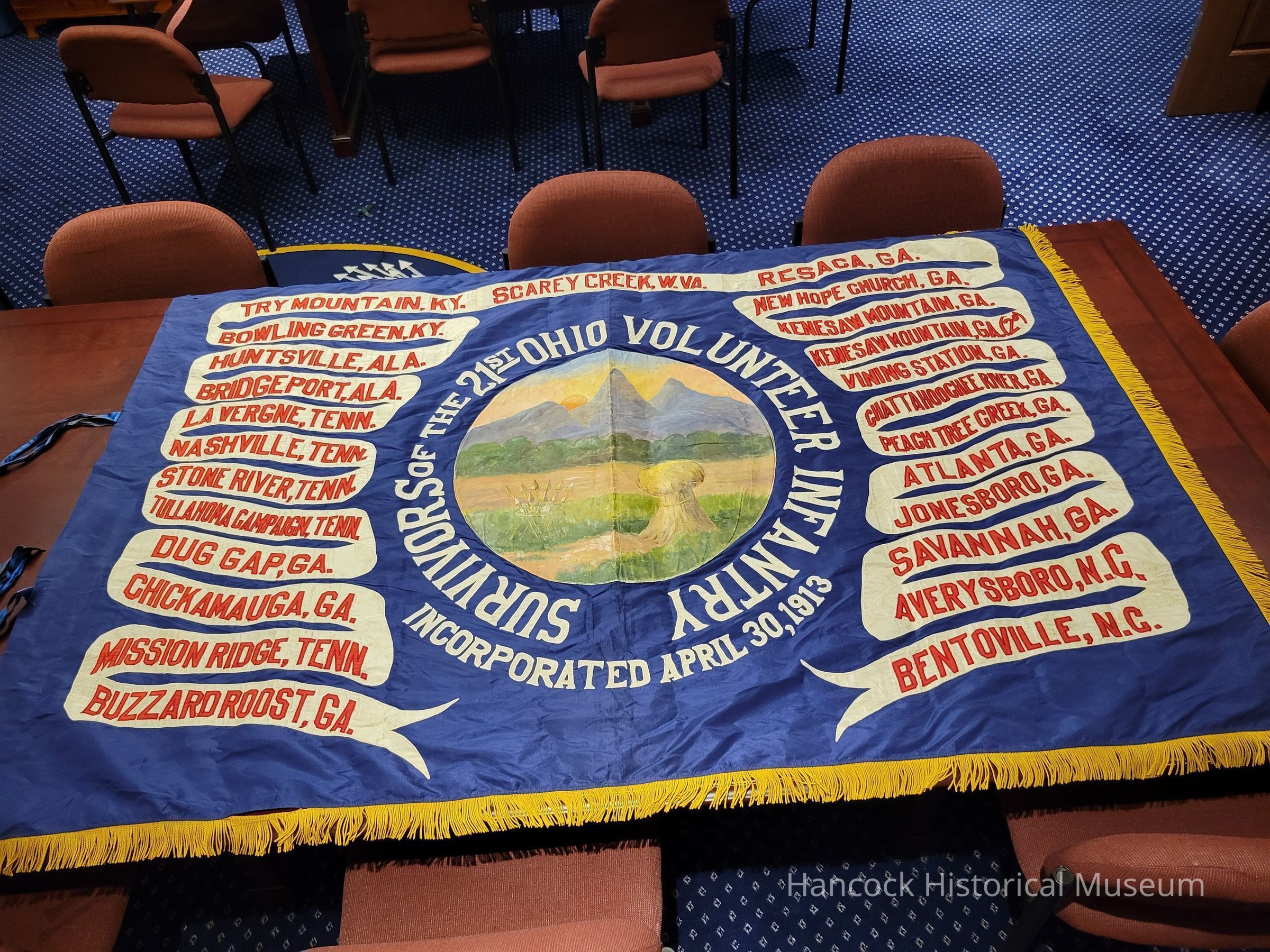 40 x 48 blue s/gold fringe banner listing battles of 21st OVI w/painted Ohio seal in center done by John Hart.